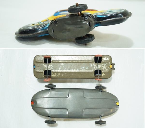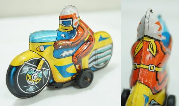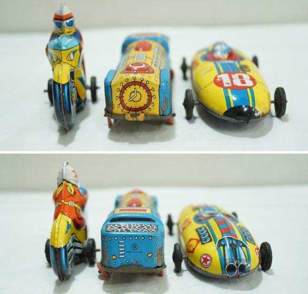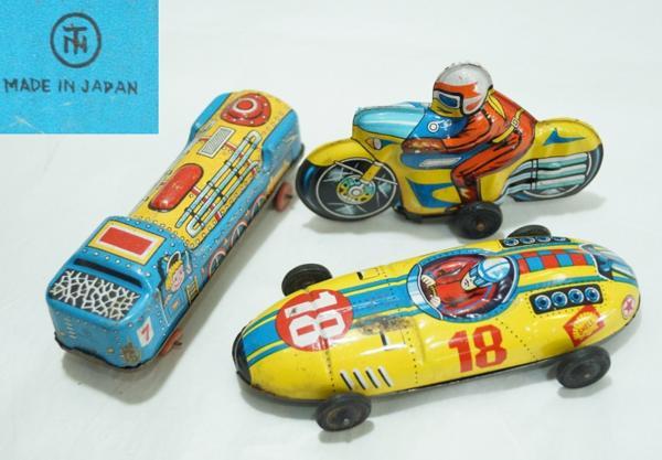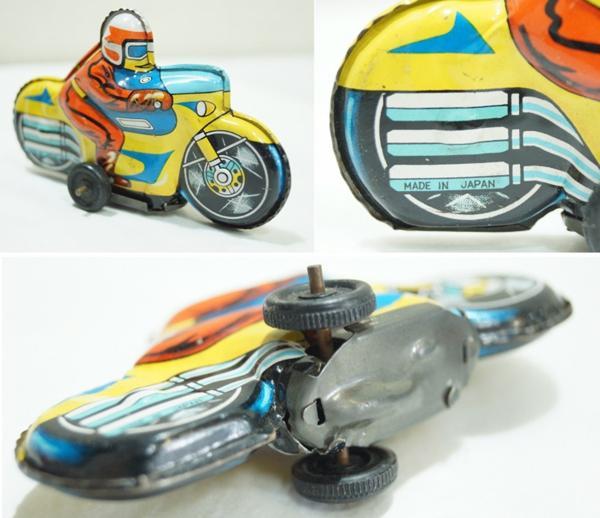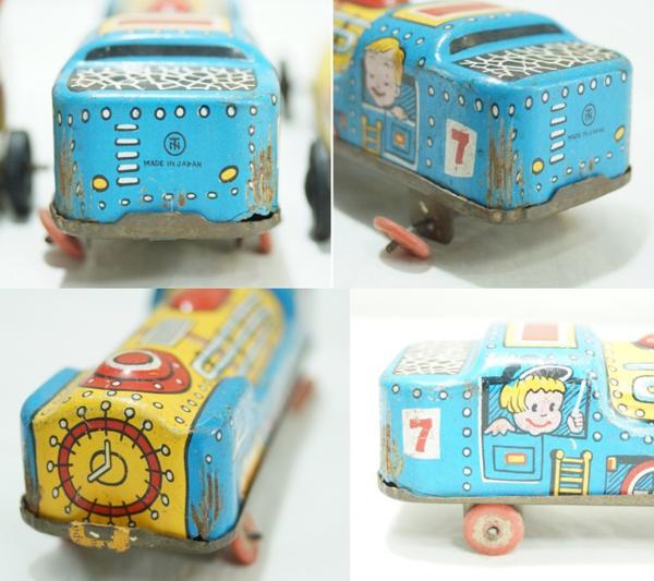素材:金属製。電車:横11.3cm×縦3.2cm×高さ3.5cm、車輪部分が歪んでいます。電車の正面とバイクの後輪に「MADE IN JAPAN」と書かれています。その他のサイズは測っていません。