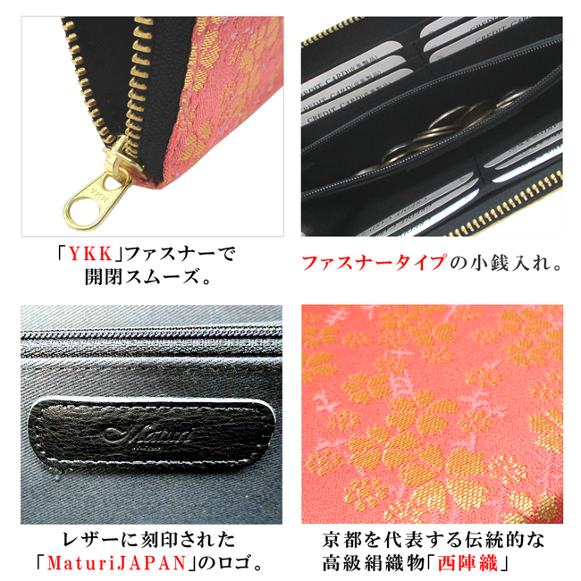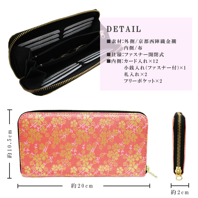 | Maturi マトゥーリ 西陣織 日本製 和柄 桜 ラウンドファスナー 長財布 MR-080 選べるカラー 定価30,000円 京都の西陣織金襴を贅沢に使用した和柄ラウンド長財布です。 ※西陣織(にしじんおり)とは、京都の先染め織物をまとめた呼び名で、錦・緞子・朱珍・絣・紬などの多彩な糸を用いた先染めによる高級絹織物。 桜柄で可愛らしさもあり、落ち着いた中にも高級感があります。 和装時にはもちろん、カジュアルにも使用いただけるデザインで年齢を問わず無難に幅広い用途でお持ち頂けます。 プレゼントや外国人の方のお土産に喜ばれるお財布です。 カードが12枚収納でき、フリースペースには多くなりがちなレシートや、 チケットなどをしっかり仕分けできる機能性・実用性を追い求めてたどり着いたスペックです。 人気のラウンドファスナータイプで大きくマチが開き、出し入れがスムーズ。 ファスナー部分にはYKK社製ファスナーを使用し、開閉がスムーズで耐久性も抜群です。 ●日本製/Made in Japan ■カラー:ピンク ■サイズ(約):横20cm×縦10.5cm×マチ2cm (実物で計測している為、多少の誤差が生じますことはご容赦下さい。) ■素材:外側/京都西陣織金襴、内側/布 ■仕様:ファスナー開閉式 ■内側:カード入れ×12、小銭入れ(ファスナー付)×1、札入れ×2、フリーポケット×2 ■付属品:専用BOX ■新品・未使用 --製品について-- ※こちらの商品は生地によって柄の位置が一つ一つ異なります(大幅な違いはございません)。 ※製作過程により多少の傷・汚れ、縫い目が粗い・ほつれ、接着剤跡等がある場合が御座います。 ※付属品は予告なしに変更する場合がございます。 ※ご使用のコンピュータの環境や撮影の光加減によって、実際の商品のイメージと多少異なることが御座います。 これらについては予めご理解頂いた上でご購入お願いします。 | |