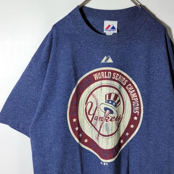 【レア】Majestic マジェスティック ヤンキース ロゴモチーフ Tシャツ 青グレー メキシコ製 デカロゴ ダメージ加工プリント 匿名配送