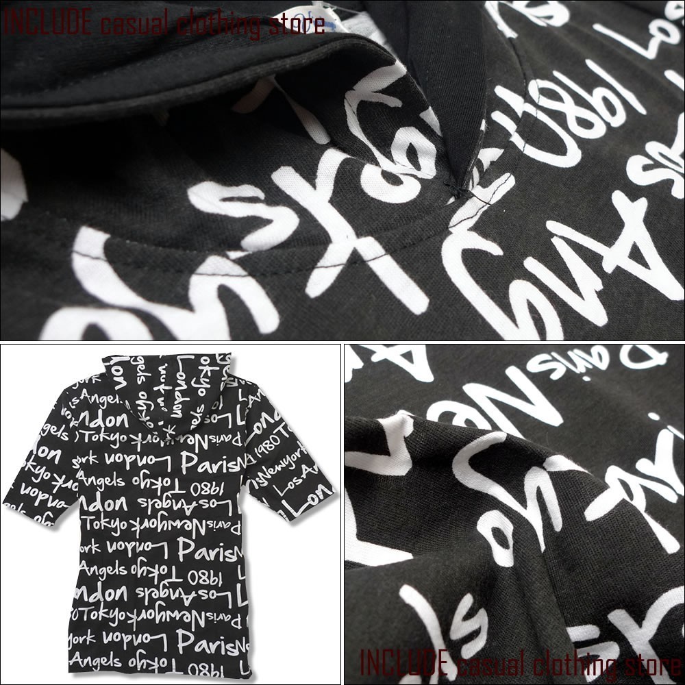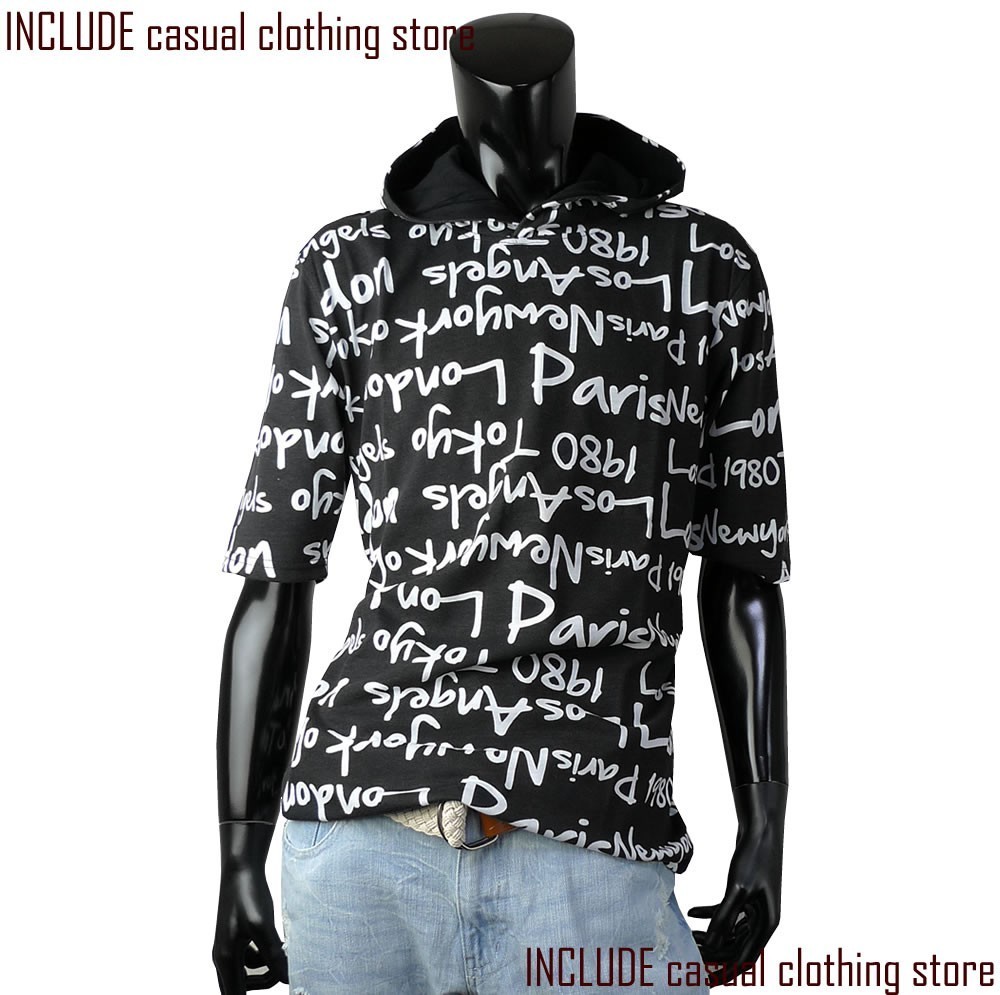 Tシャツ感覚で着用できる、カット生地の5分袖ロゴ総柄パーカーです。