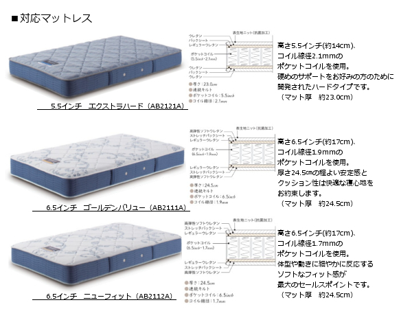 ※ご希望の場合、マットレスは、落札価格+税込¥11,000アップにて同社5.5インチエクストラハード(AB2121A)タイプに、落札価格+税込¥44,000アップにて同社6.5インチゴールデンバリュー(AB2111A)または6.5インチニューフィット(AB2112A)タイプにご変更可能です。対応マットレス詳細は画像9をご参照ください。