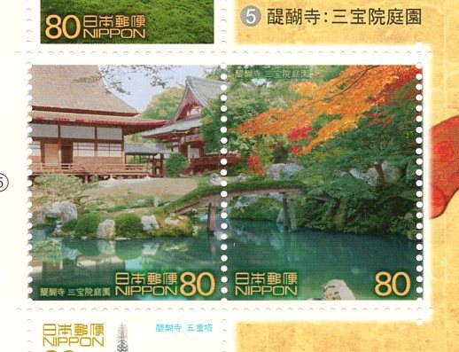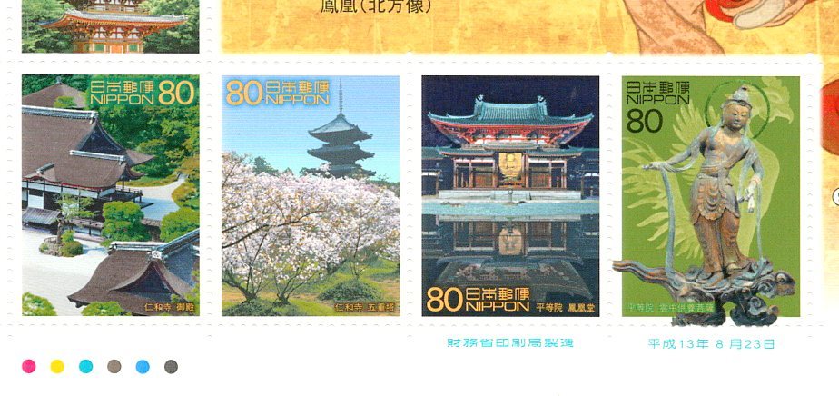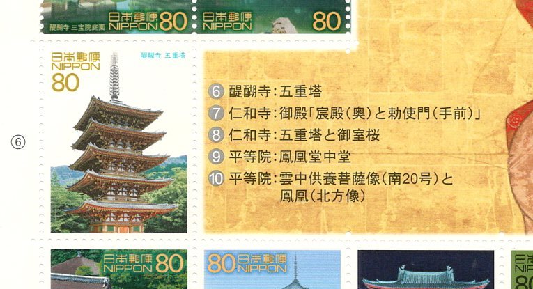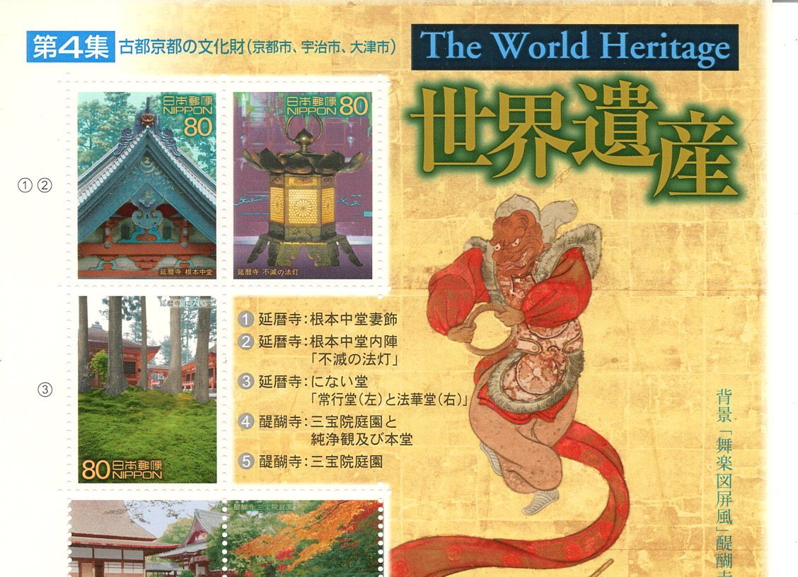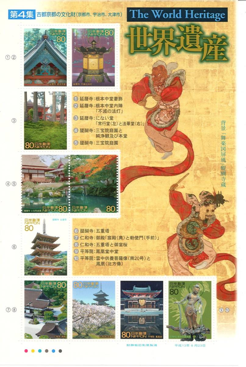 【切手シート】第2次世界遺産「古都京都の文化財」シリーズ第4集 平成13(2001)年 (延暦寺、醍醐寺、仁和寺、平等院)【未使用】