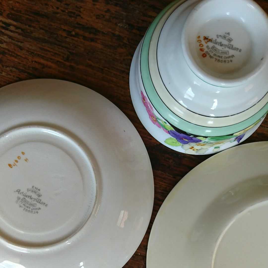 カップとソーサーの地の色は白ですが、ケーキ皿は少しクリーム色がかっています。絵柄が同じなので、私は特に気にせず使っていました。