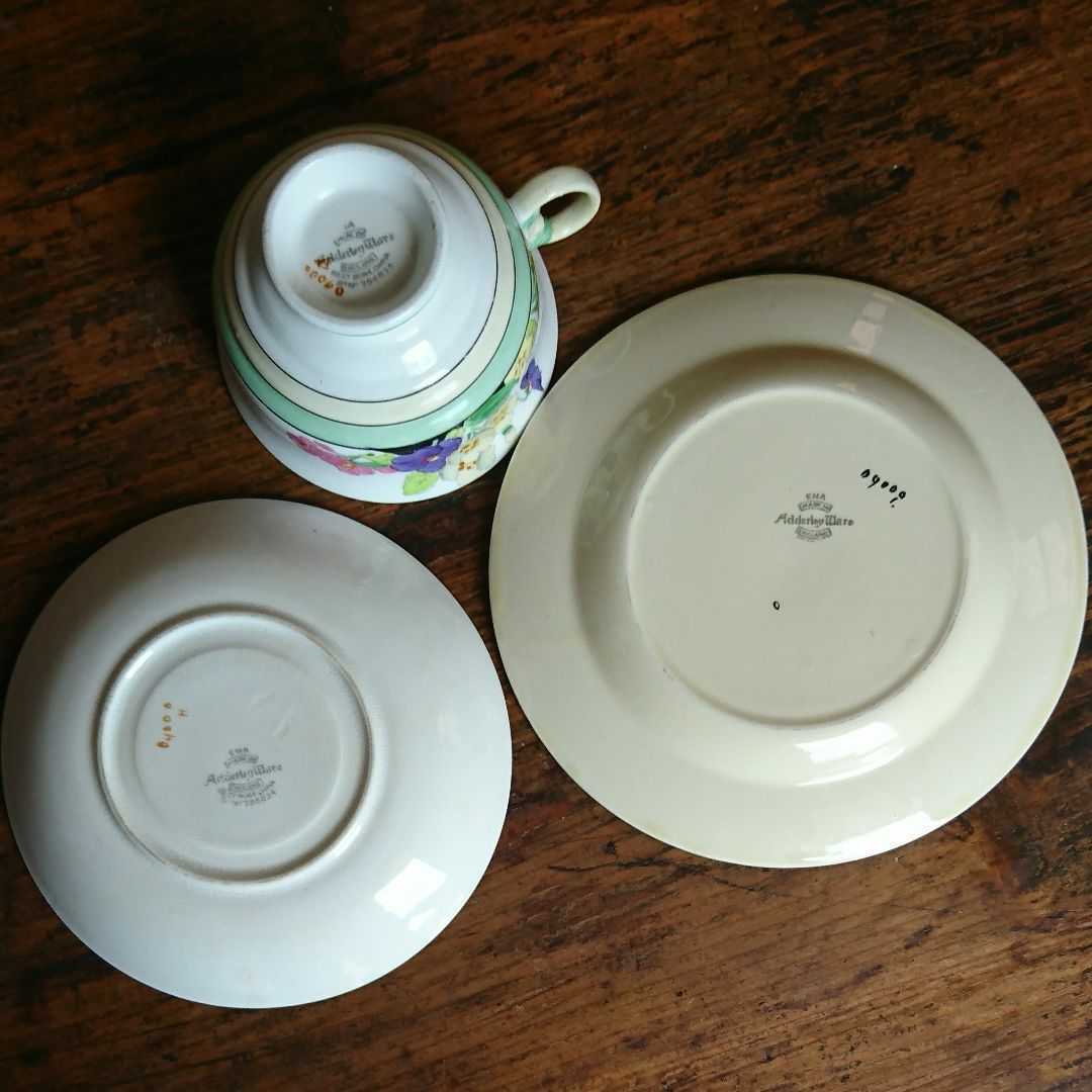 イギリスの陶器メーカー、アドレー(アダレイ、アダレー)のトリオ(カップ、ソーサー、ケーキ皿)です。