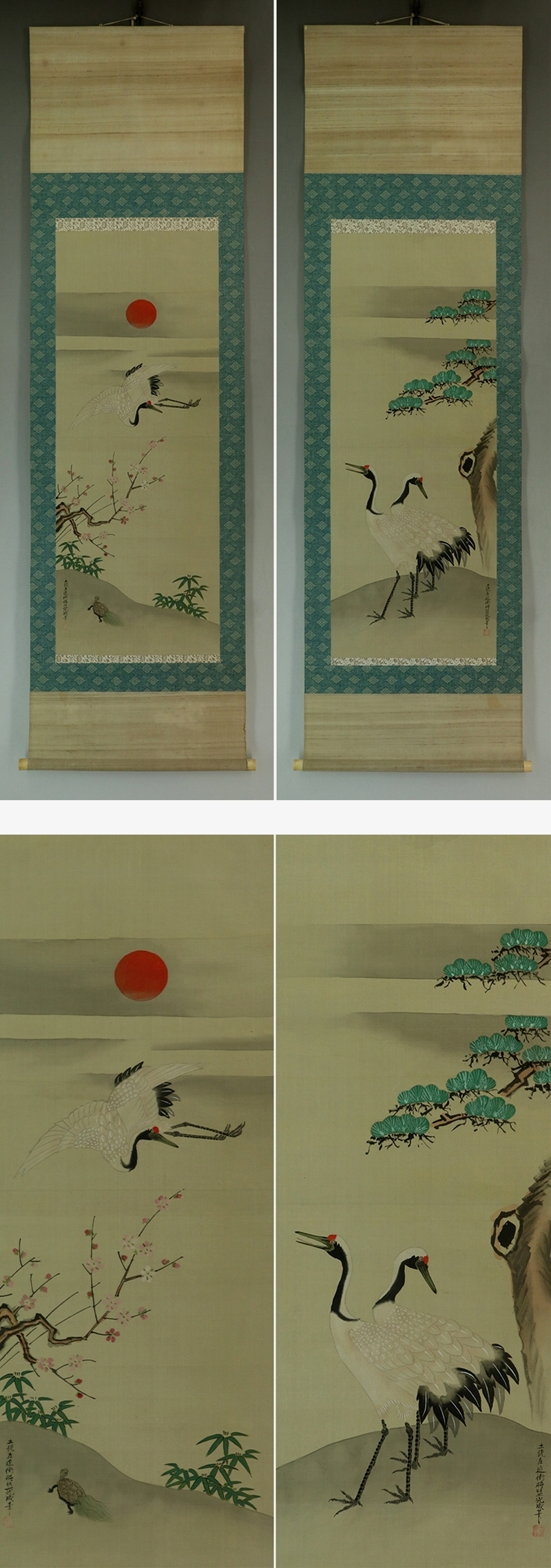 | №2205007a【真作】土佐光成【双幅・慶祝図】◆絹本◆合箱◆掛軸 | |