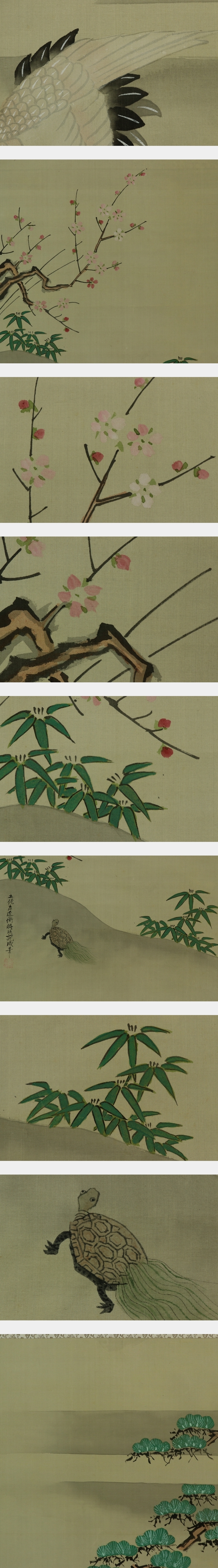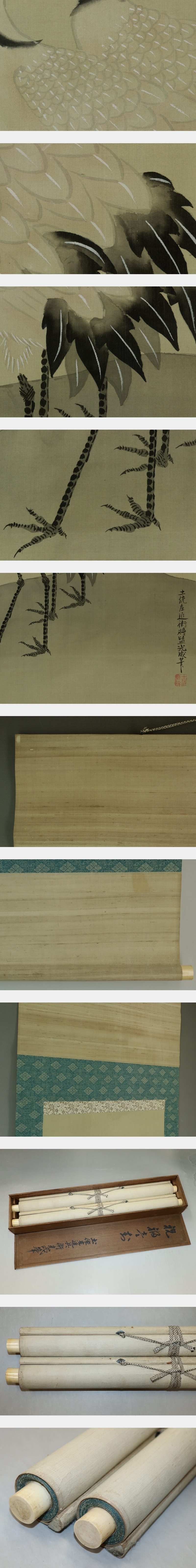 土佐光成 とさ-みつなり(1647-1710) 江戸中期の土佐派の画家。京都生。 光起の長子。幼名は藤満丸、のち左兵衛尉。 正六位下左近将監に任じられ、従五位下刑部権大輔に至る。 剃髪して常山と号する。父に学び名手と称せられる。宝永7年(1710)歿、65才。 本紙は、染み、汚れ、折れ、皺、ヤケがあります。 表装は、染み、汚れ、折れ、皺、浮き、ヤケ、くすみ、虫食い、破れ、ほつれ、 軸先に汚れとヒビがあります。 【サイズ】 作品 横約41.5cm×縦約108.5cm 表装 横約55cm×縦約190cm |