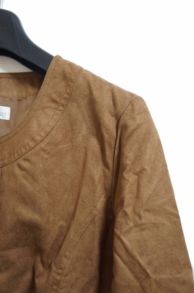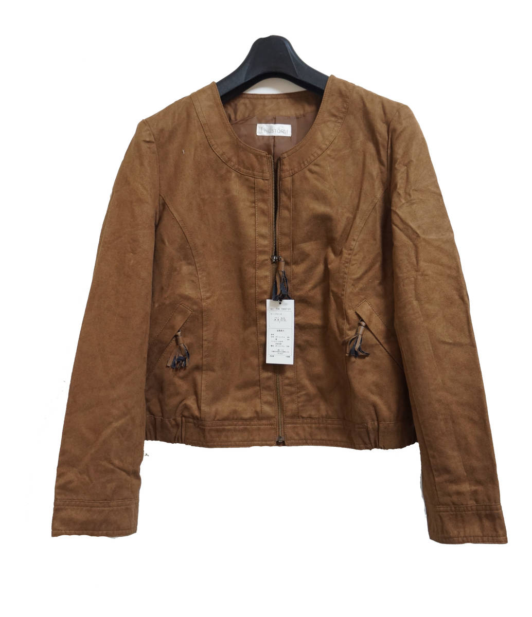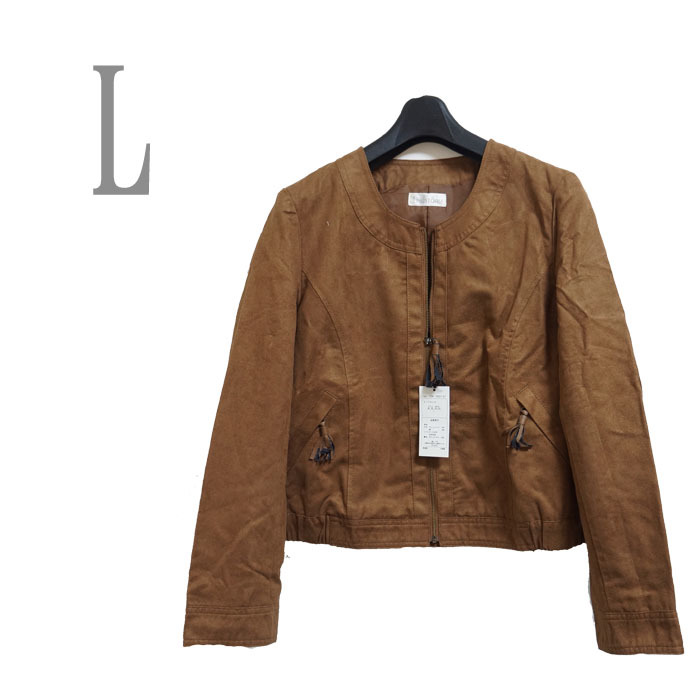 ●新品/フェイクレザー/ジャケット/ブラウン系/L/フリンジ/ノーカラー/レディース●い0409