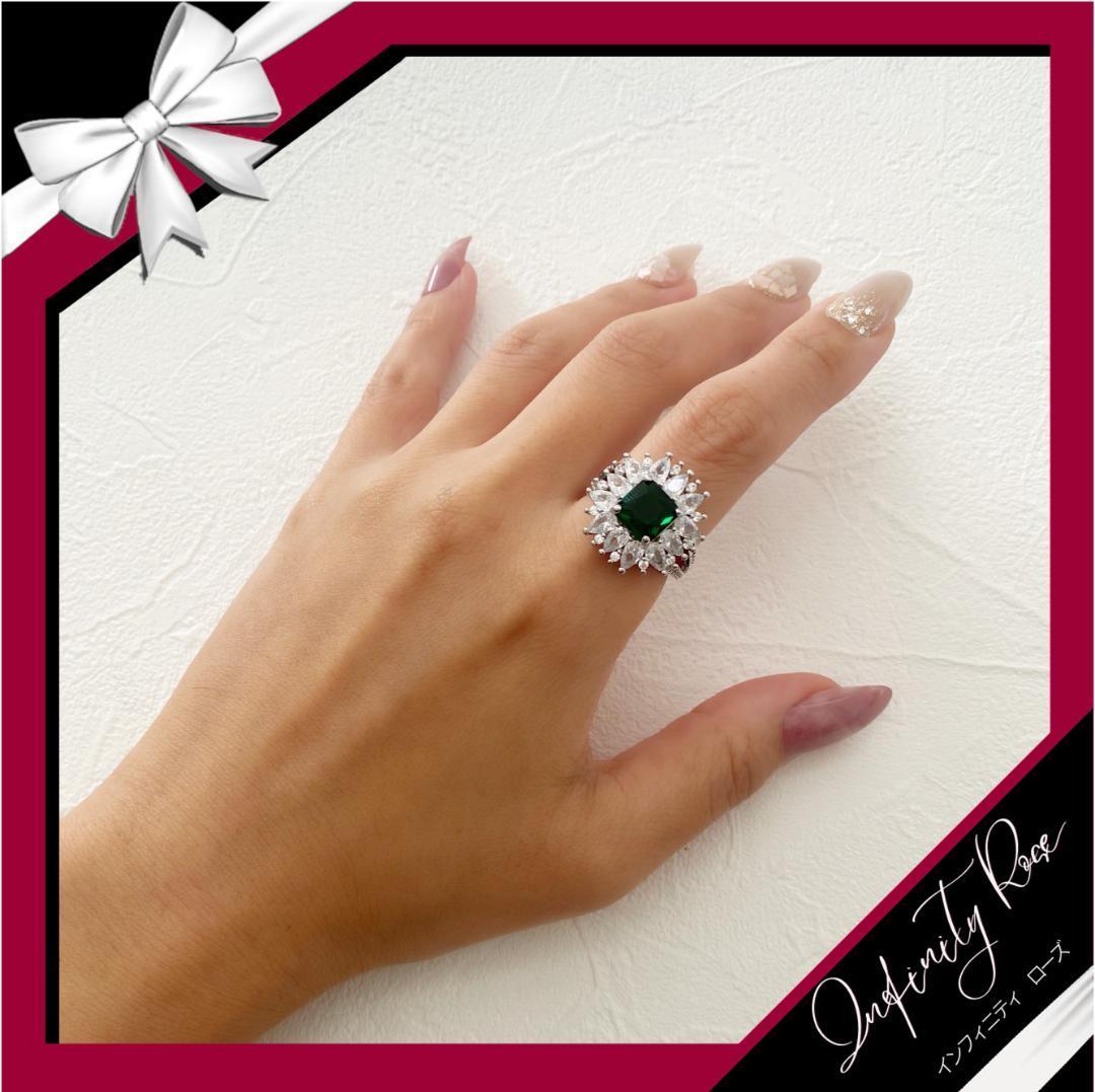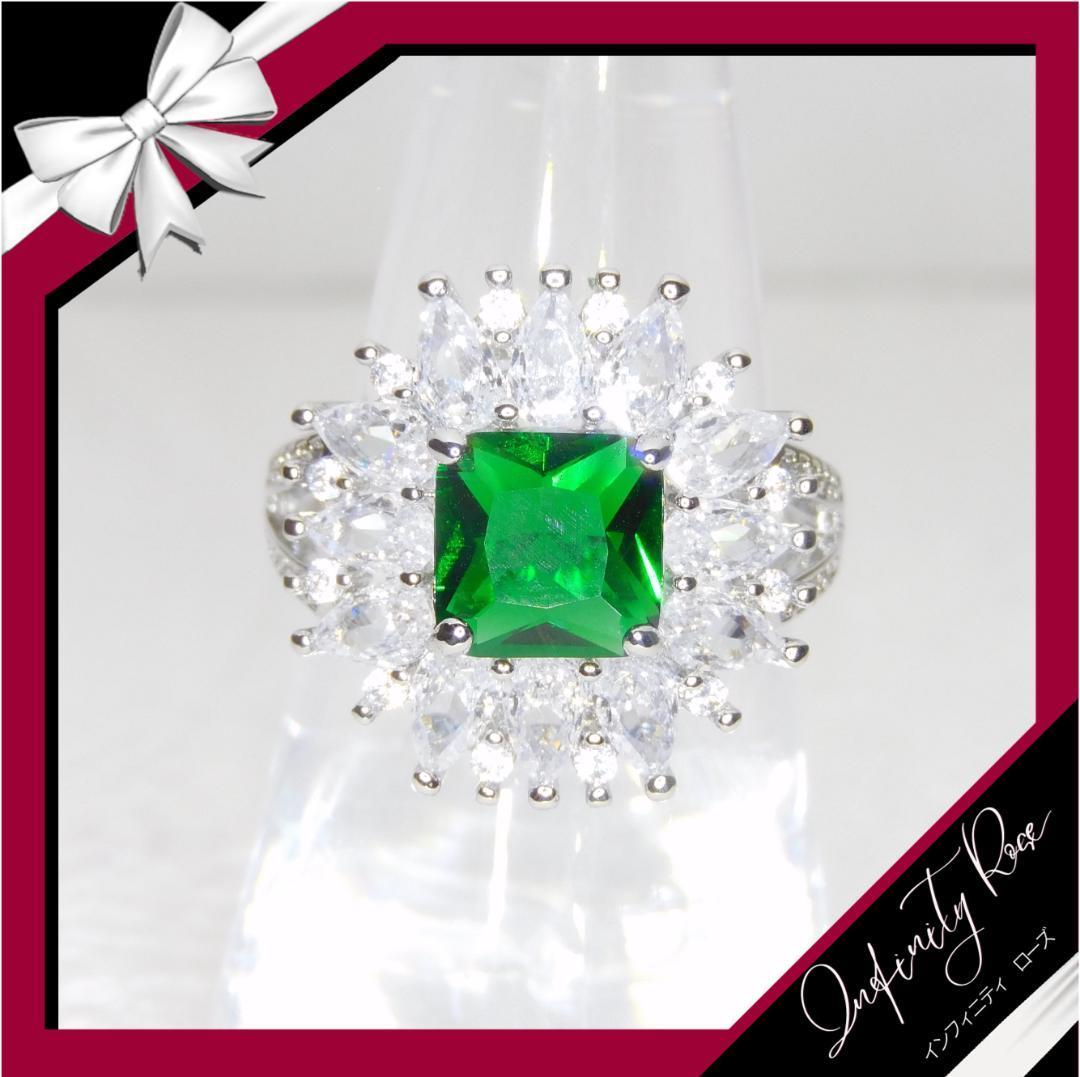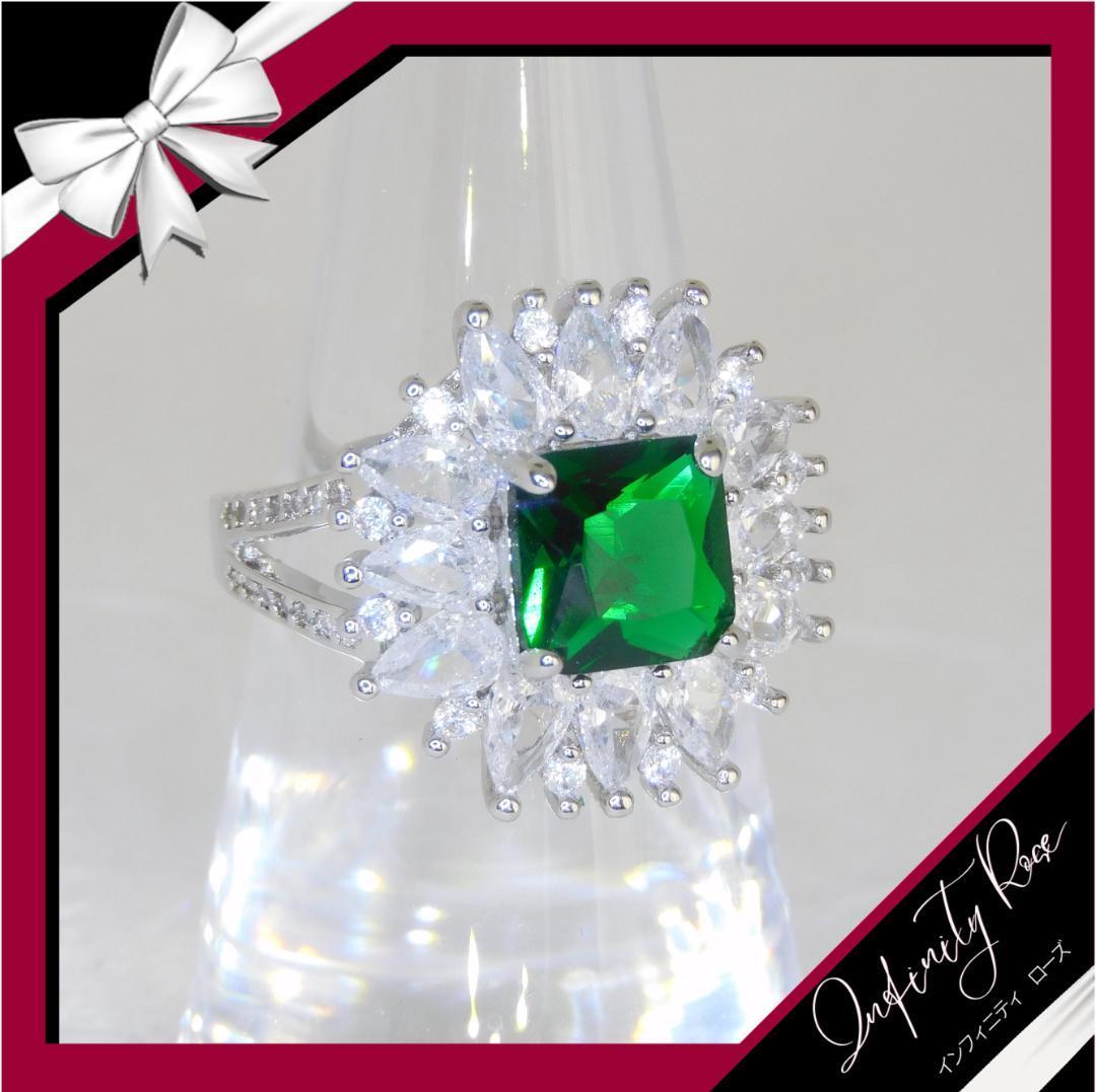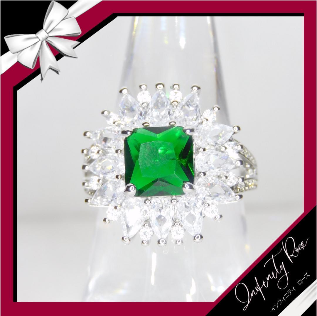 (R043SG)17号 グリーン豪華煌めく手元クリスタルワイドリング 爪留指輪 スワロフスキー製クリスタル使用