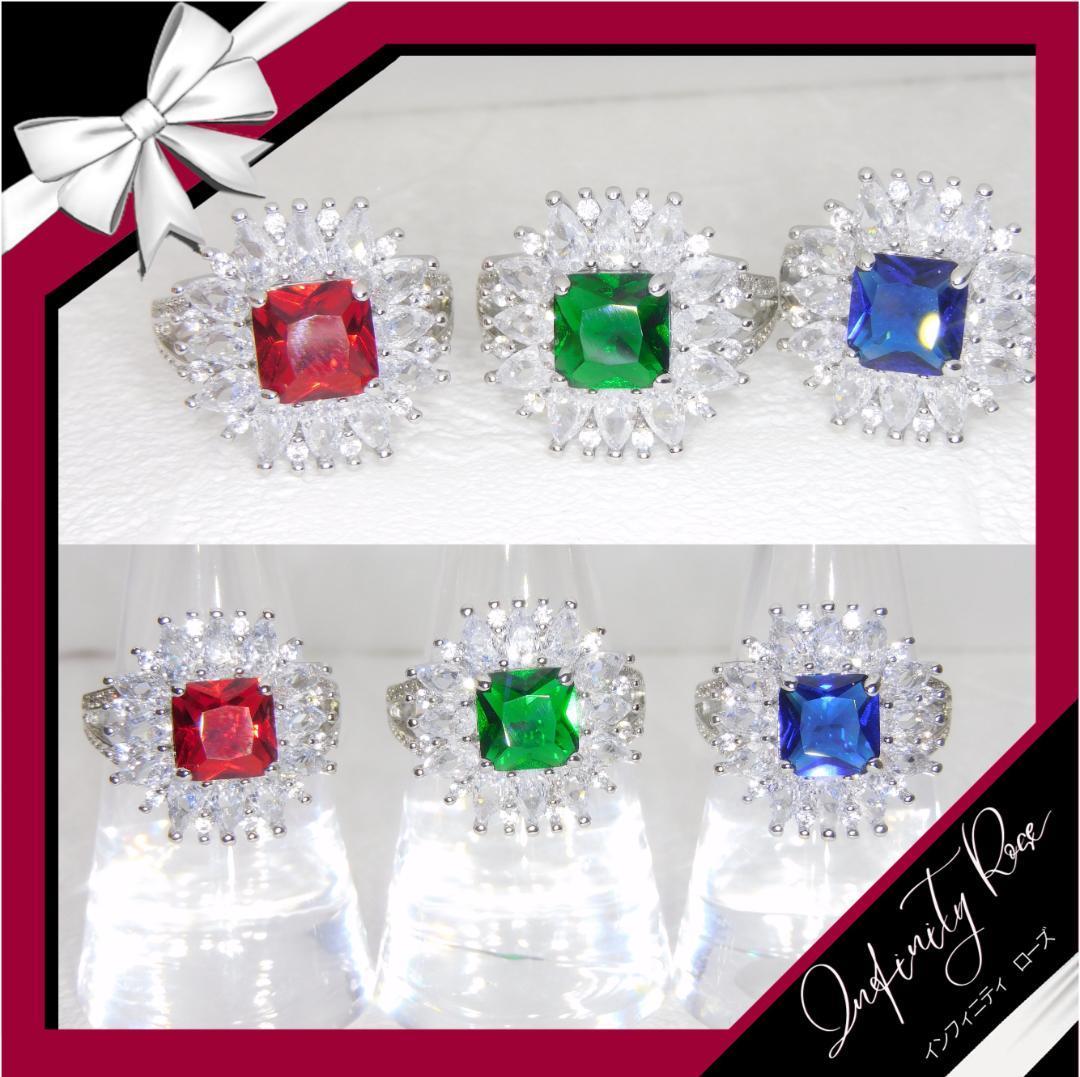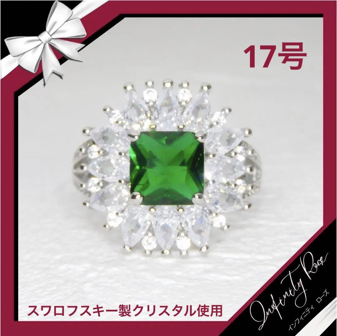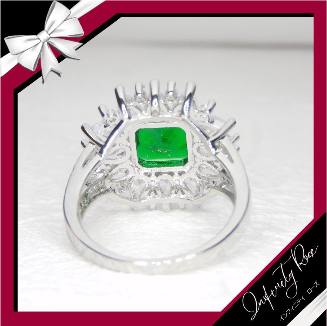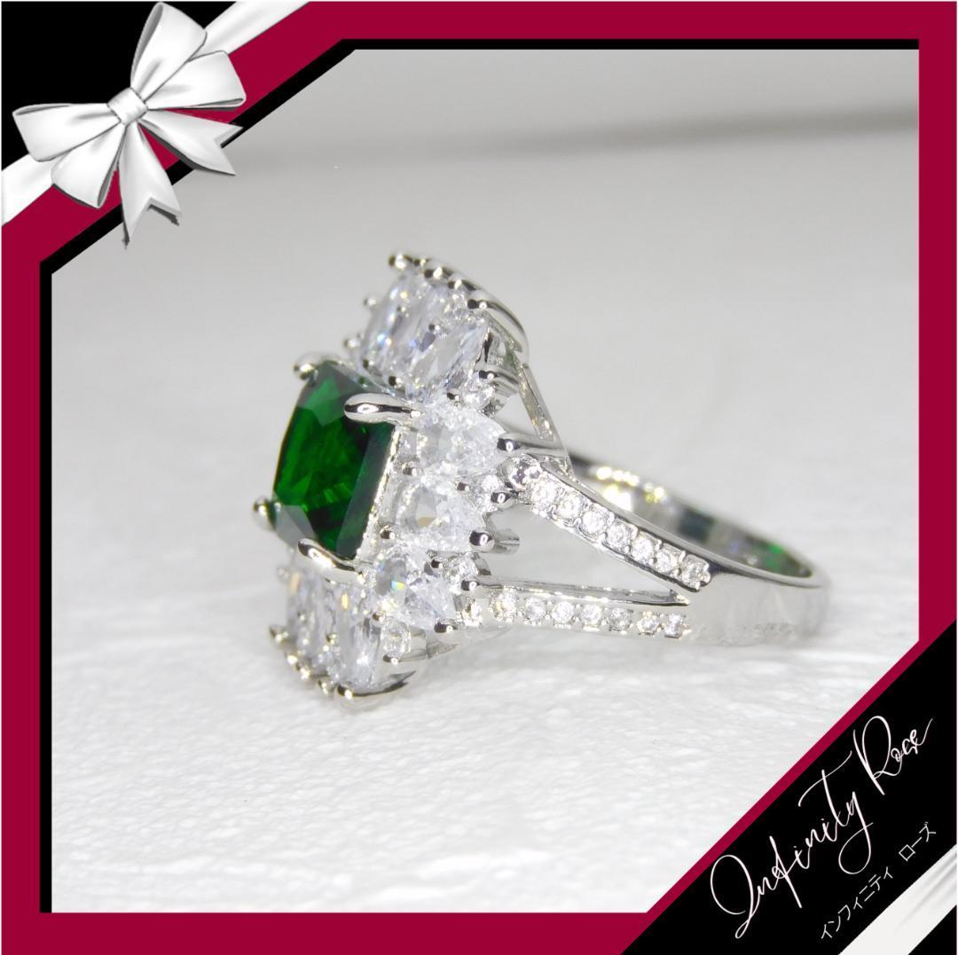 (R043SG)17号 グリーン豪華煌めく手元クリスタルワイドリング 爪留指輪 スワロフスキー製クリスタル使用