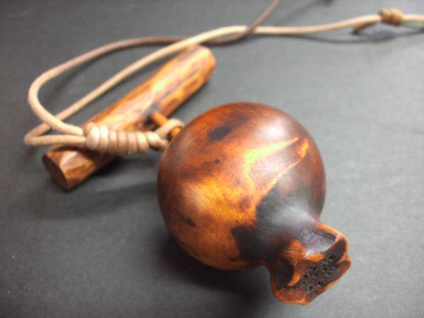 樹齢400年ものの榧の木を使ってザクロを彫り出し、仕上げに拭き漆を行う事により400年ものの持っている杢が方々に出て来て面白いザクロとなりました。