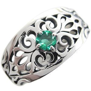 5月誕生石エメラルドを一粒使用した、トライバルデザインのシルバー製メンズリング(指輪)です。