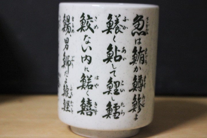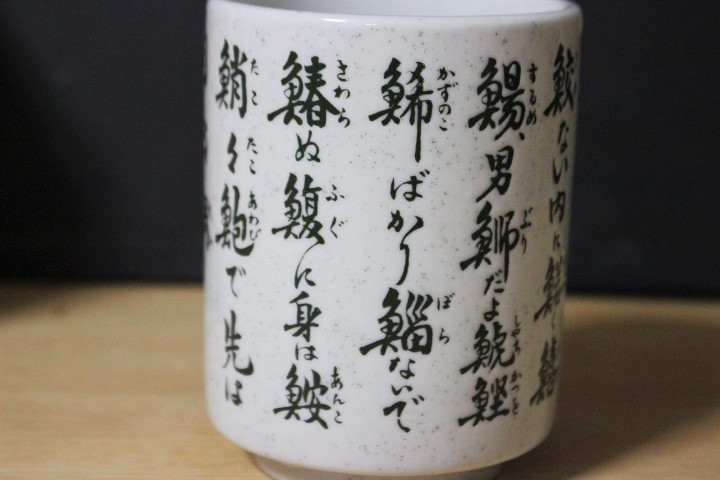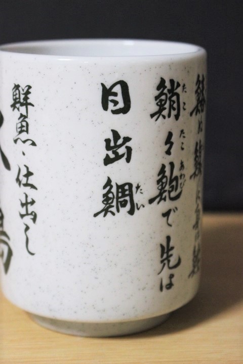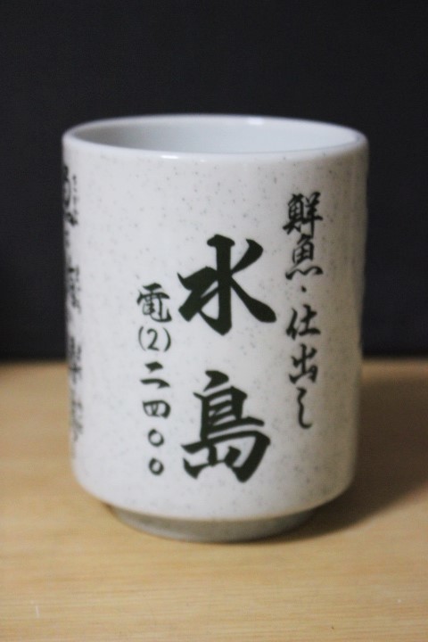 ▲つ-462 湯呑 茶碗 保管品 箱なし 鮮魚 仕出し 水島 ※ 外観:魚の名前が色々書かれています 高さ10.6cm 径8.2cm 重さ315g