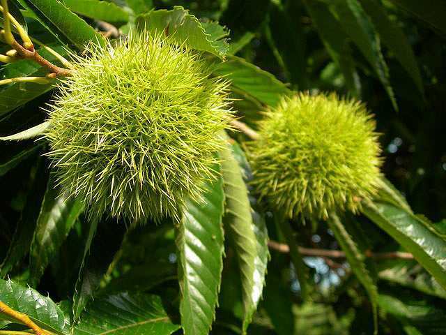 クリは40m程度になる落葉高木です。日本全国の山林に自生しています。クリの実は食用に多く利用されています。葉は鋸歯があり30cm程度になります。花は白く臭いがつよいです。花からは多くの蜂蜜が取れます。秋にイガに覆われた実が落ちます。雌雄異花です。