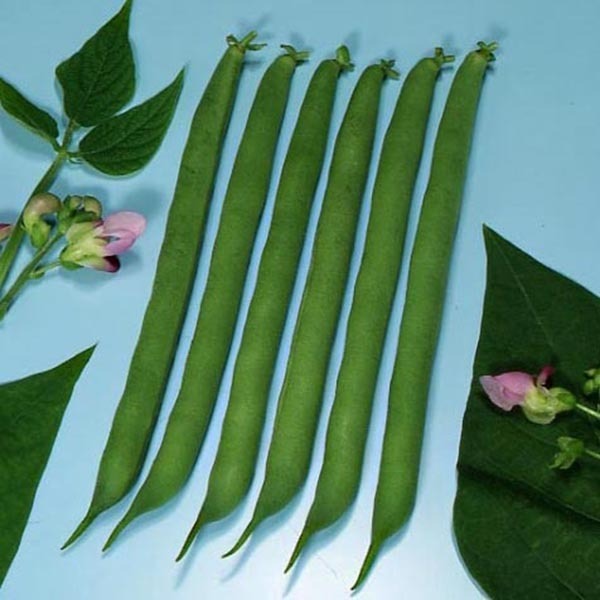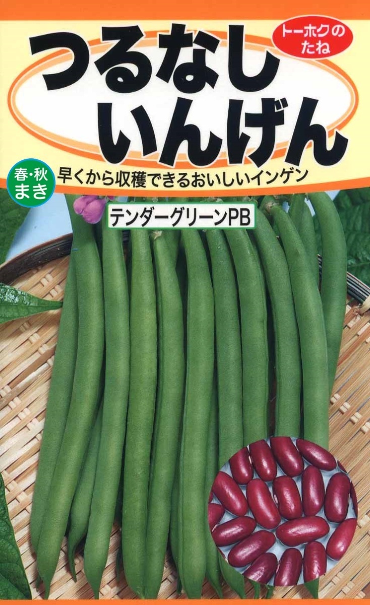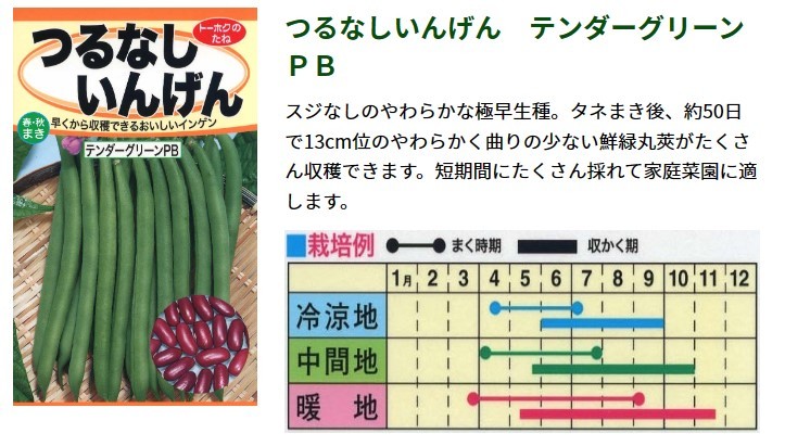 タネまき後、約50日で13cm位のやわらかく曲りの少ない鮮緑丸莢がたくさん収穫できます。