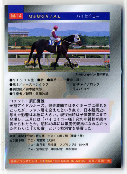★ハイセイコー M14 (エラー版) メモリアルカード バンダイ サラブレッドカード 96年上半期版 増沢末夫 画像 写真 競馬カード 即決 | |