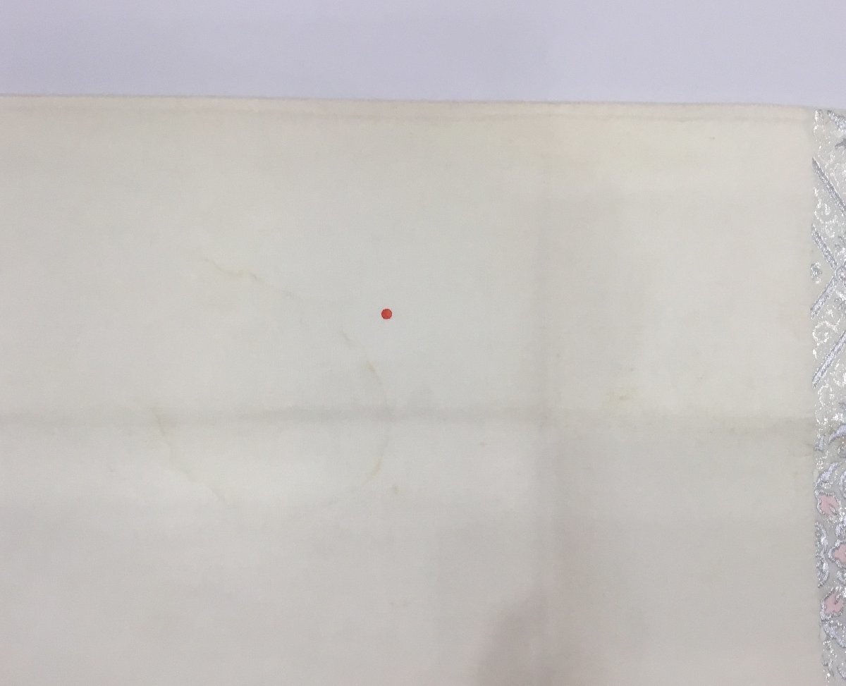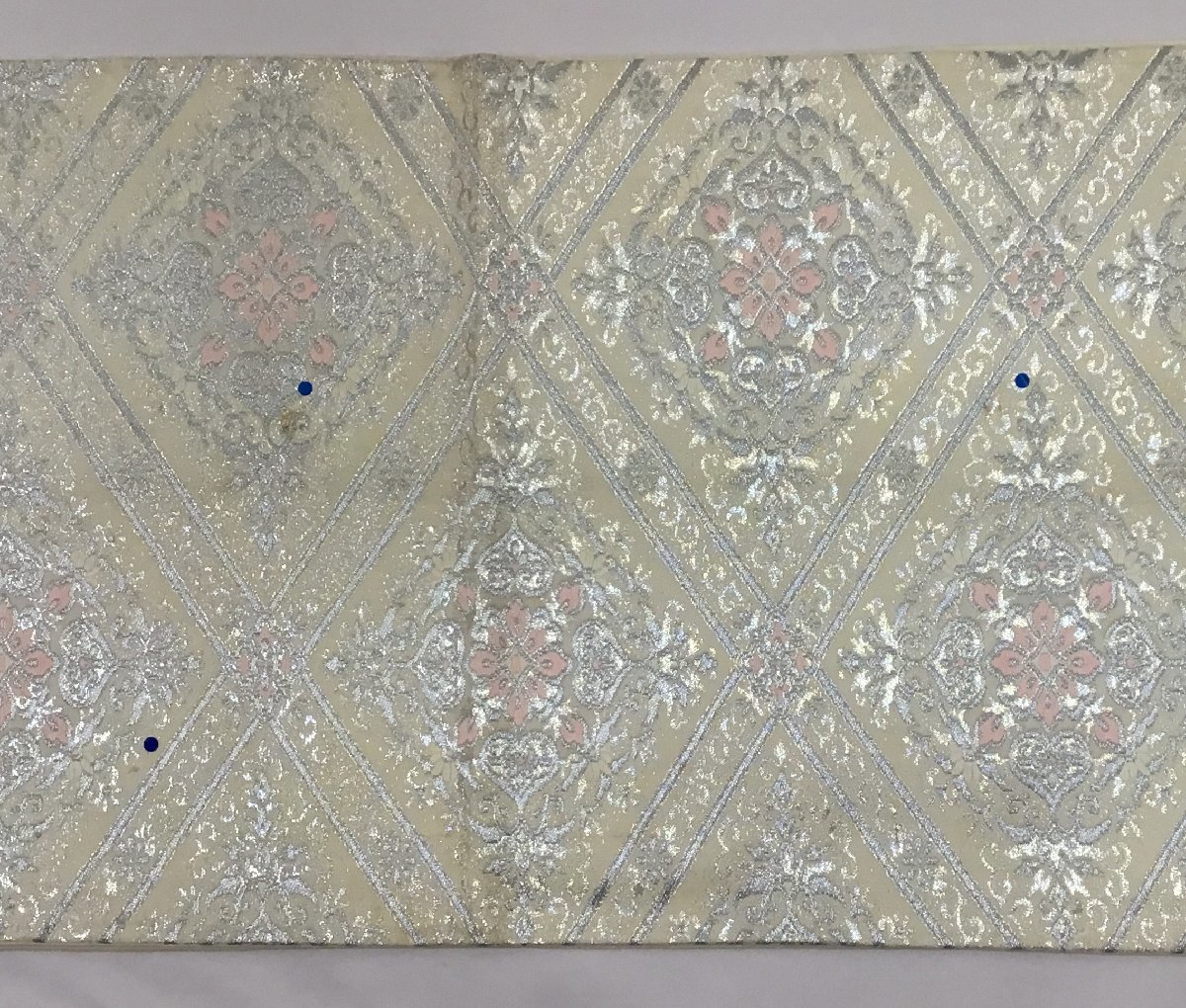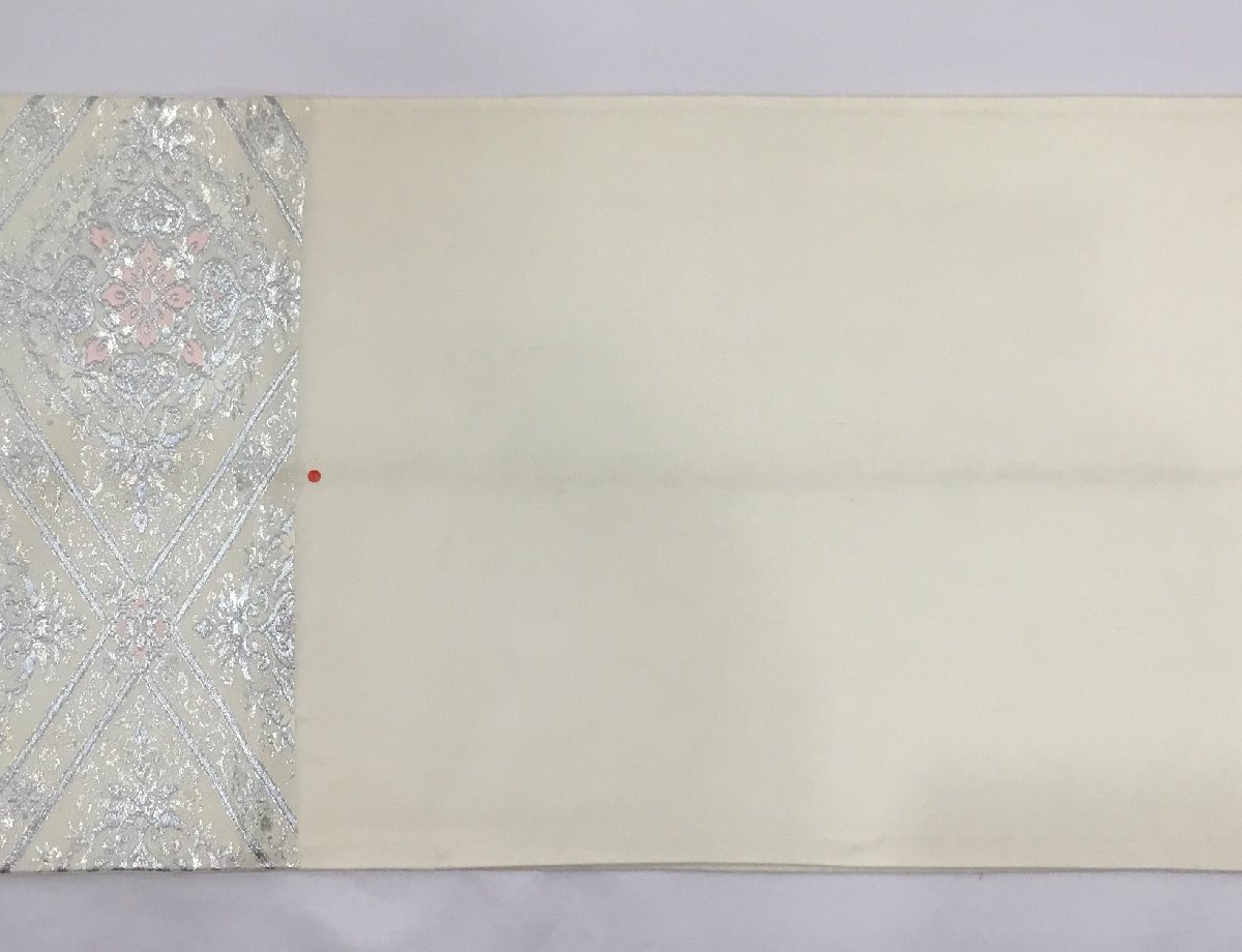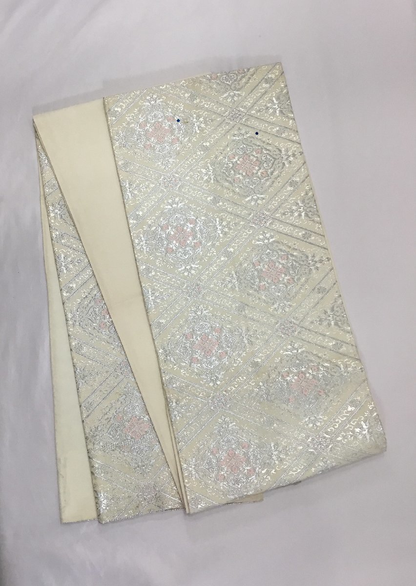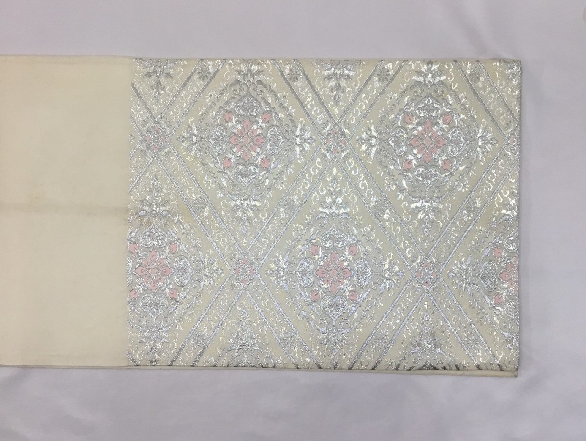 沢山の出品の中からご覧いただきまして誠にありがとうございます! 今回、ゆずりはから出品している製品は『西陣織 袋帯』です。 六通 仕立上がりの袋帯です。 手、腹の裏と、腹の無地部分に小さいシミが数か所と大きいシミが2ケ所ありますが、いずれも着用時は見えません。着用時に見える所には、シミ汚れ等はありません。シルバーの地色に、斜の格子と華麗な華文を織り込んだ重厚な文様で、留袖や訪問着などに合わせてフォーマルに着用していただけます。 ※ゆずりはでは、同時落札の場合、10点まで同梱の場合送料一律900円(北海道・沖縄除く)でご提供しております。 但し、商品の大きさや梱包の仕様上複数になる場合は発送個数分の送料となります。 |