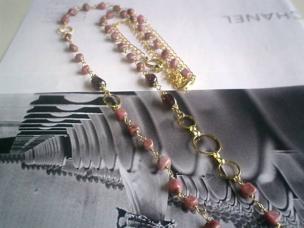 ジャンヌの幸せ・・シリーズです♪お気に入りのピンクと赤・・シックなロードナイトのネックレスです♪深い赤のガーネットを合わせて大人のロマンチックしています♪ロードナイトは6ミリ位のミニ・タンブル、ガーネットは10×8ミリ位のオーバルです♪長さは全長102センチ位で調節自由です♪2連にされても素敵です♪同じデザインの長さ違いのネックレスやブレスレットも出品しています♪シンプルで合わせやすいデザインを考えて作りました♪♪ハンドメイドをご理解頂いてノークレーム、ノーリターンでお願いします
