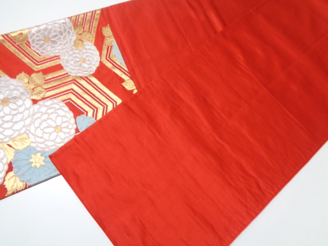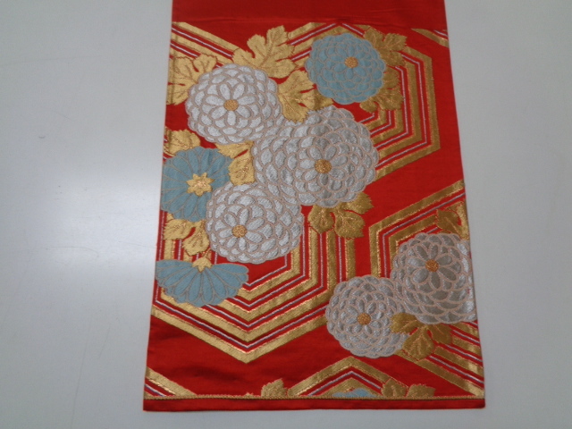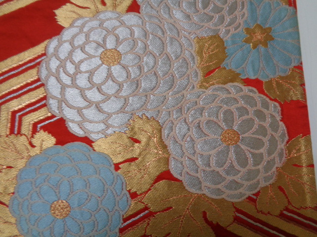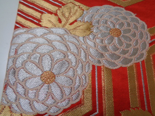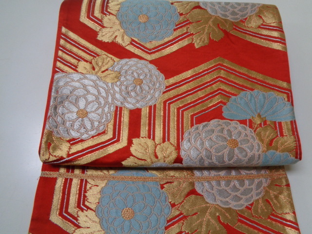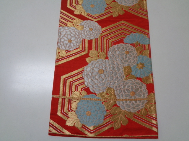 d379-80 袋帯 正絹 六通 金糸 銀糸 亀甲菊花文