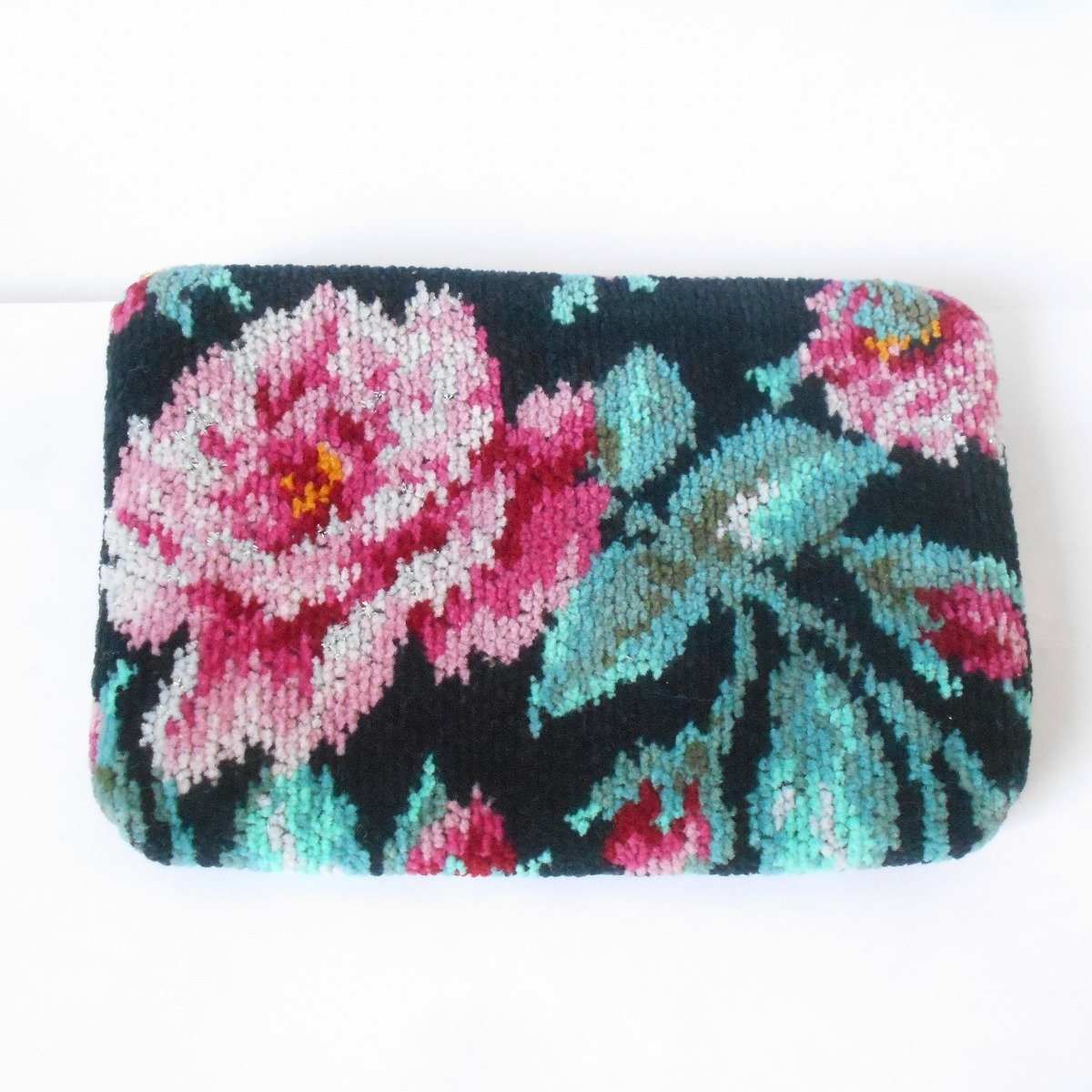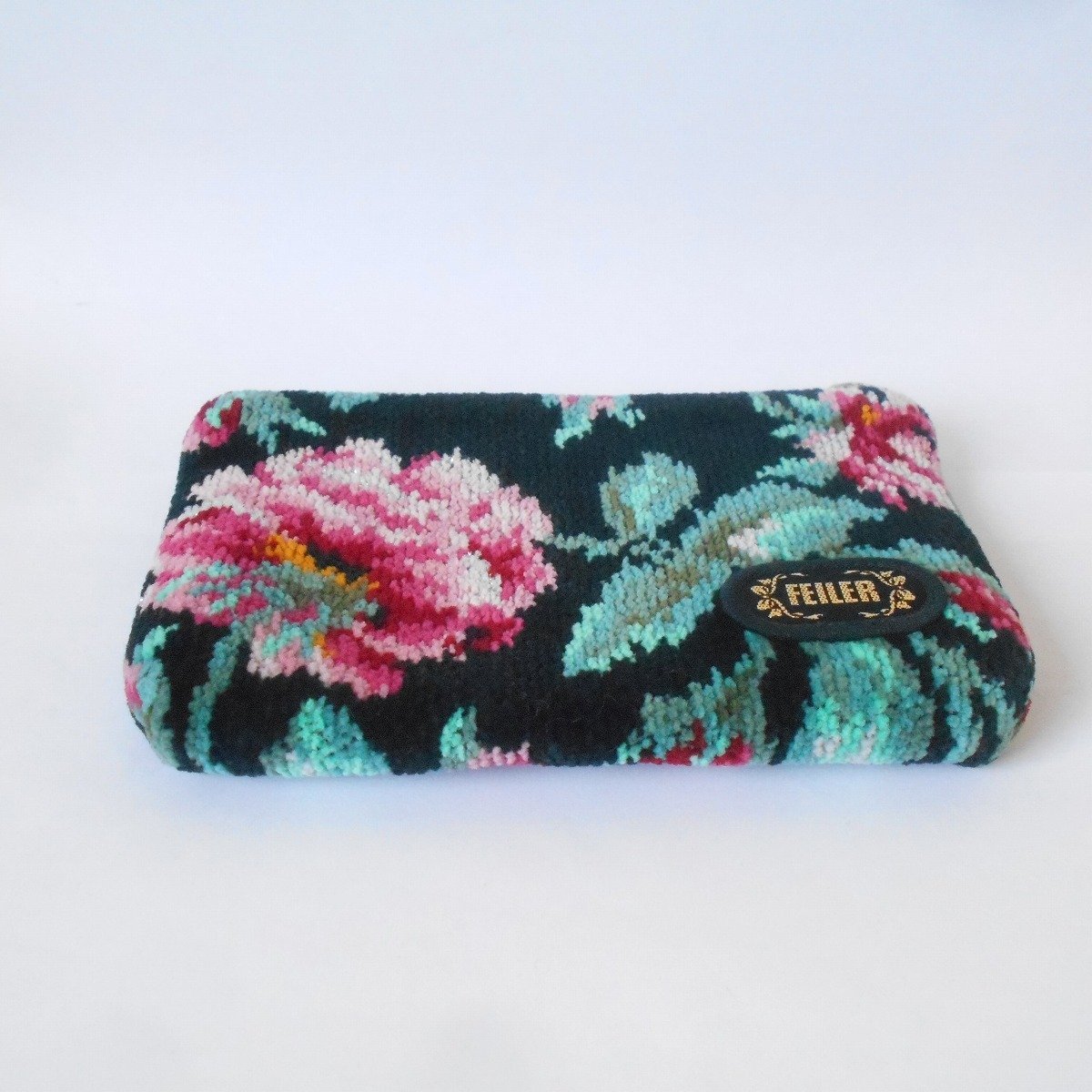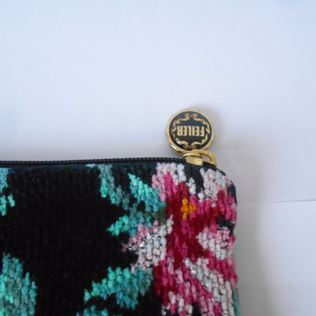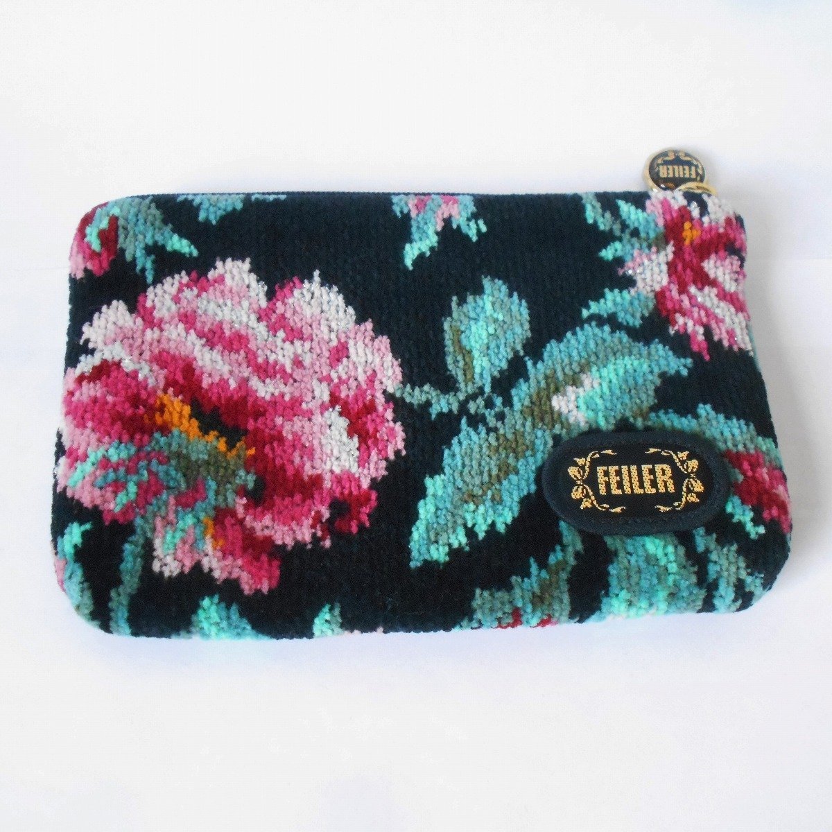 【ポイント】フェイラーのミニポーチになります。お色は黒色ベースで多色使用の花柄入りで一部ラメが使用されています。
