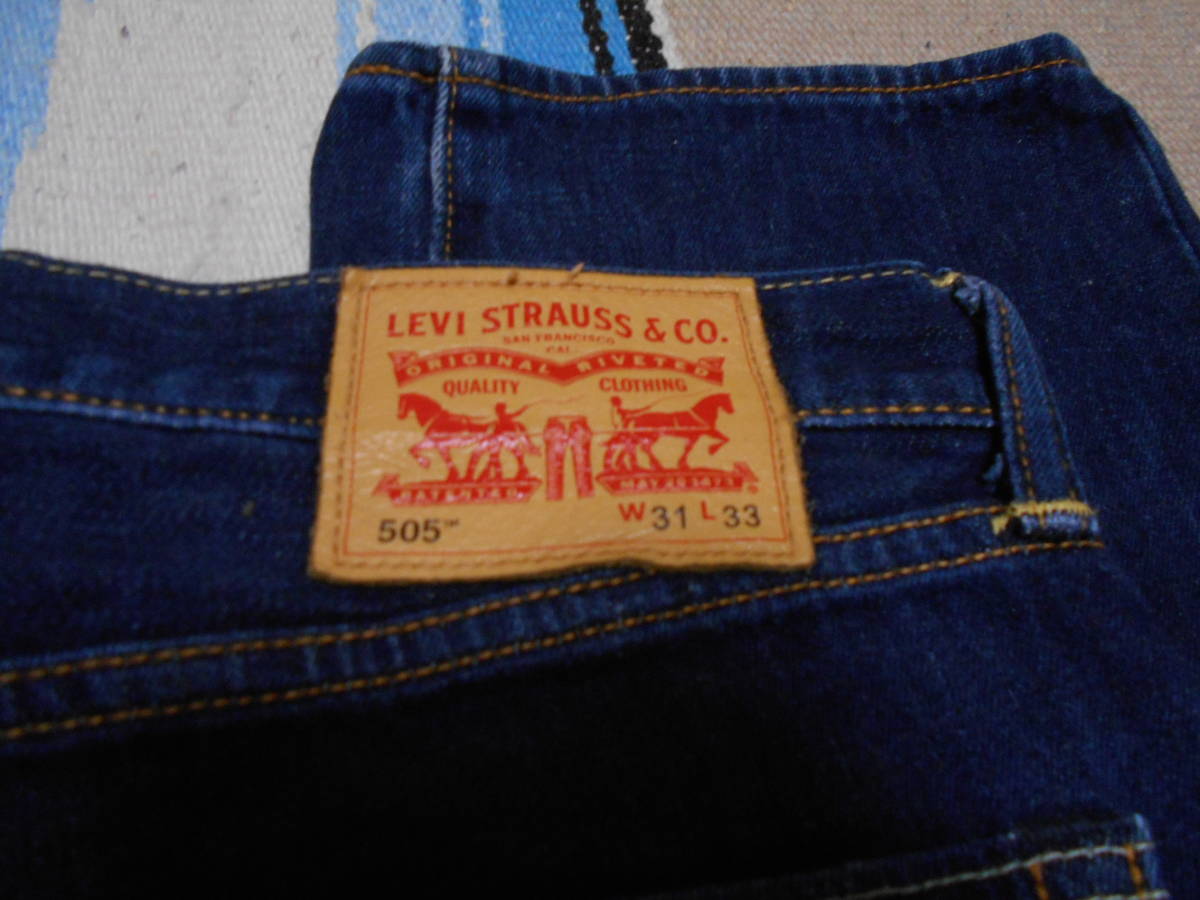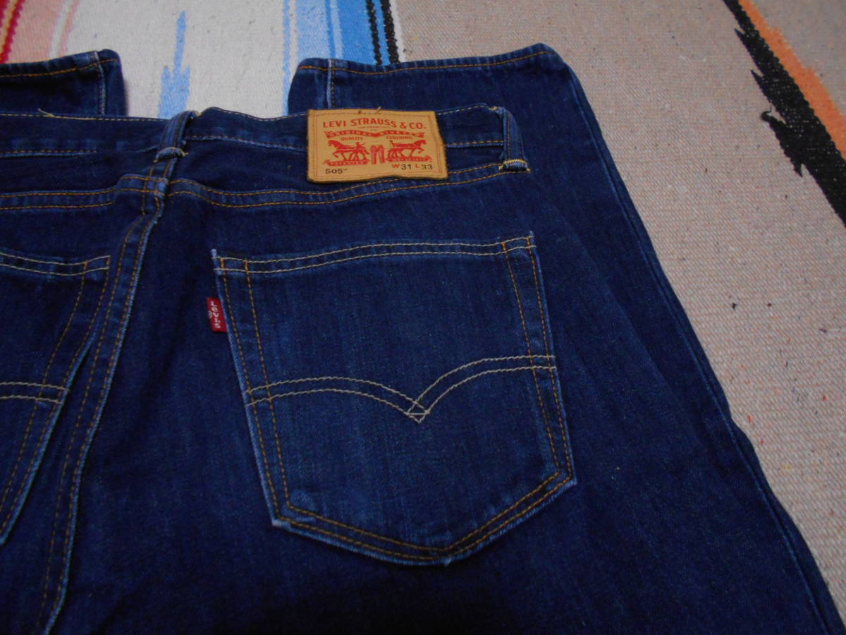 505 特有、ワタリはやや余裕があり裾が適度にスリムな洗練されたシルエットライン、肌触り良いビンテージハイオンスデニム素材、本革レザーパッチ、サイドシーム割縫い、バックポケットトップの紺カンヌキ補強 等等...拘り有るディテール