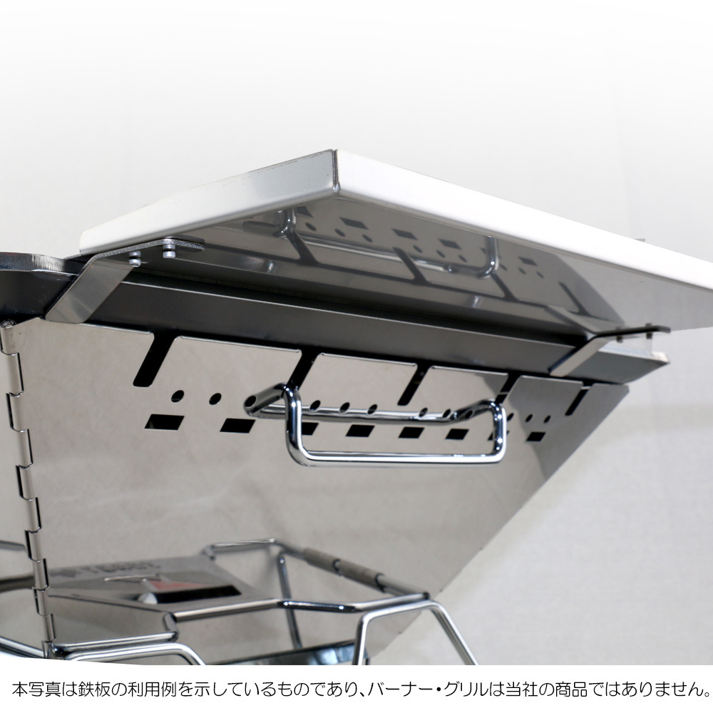当店スタンダードタイプ極厚鉄板の曲げ部分にピッタリ取り付く設計。裏面の2本のツメが鉄板にしっかりはまるよう板厚別に設計してあるため、重みのある耐熱容器などを乗せても安定感があります。チョコレートフォンデュやチーズフォンデュなどスイーツから鉄板料理まで、省スペースでキャンプやバーベキュー、ご自宅でも楽しめるアイテムです。