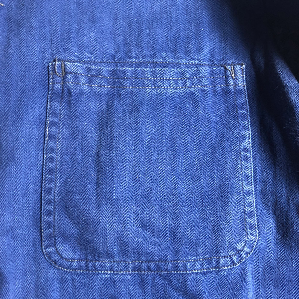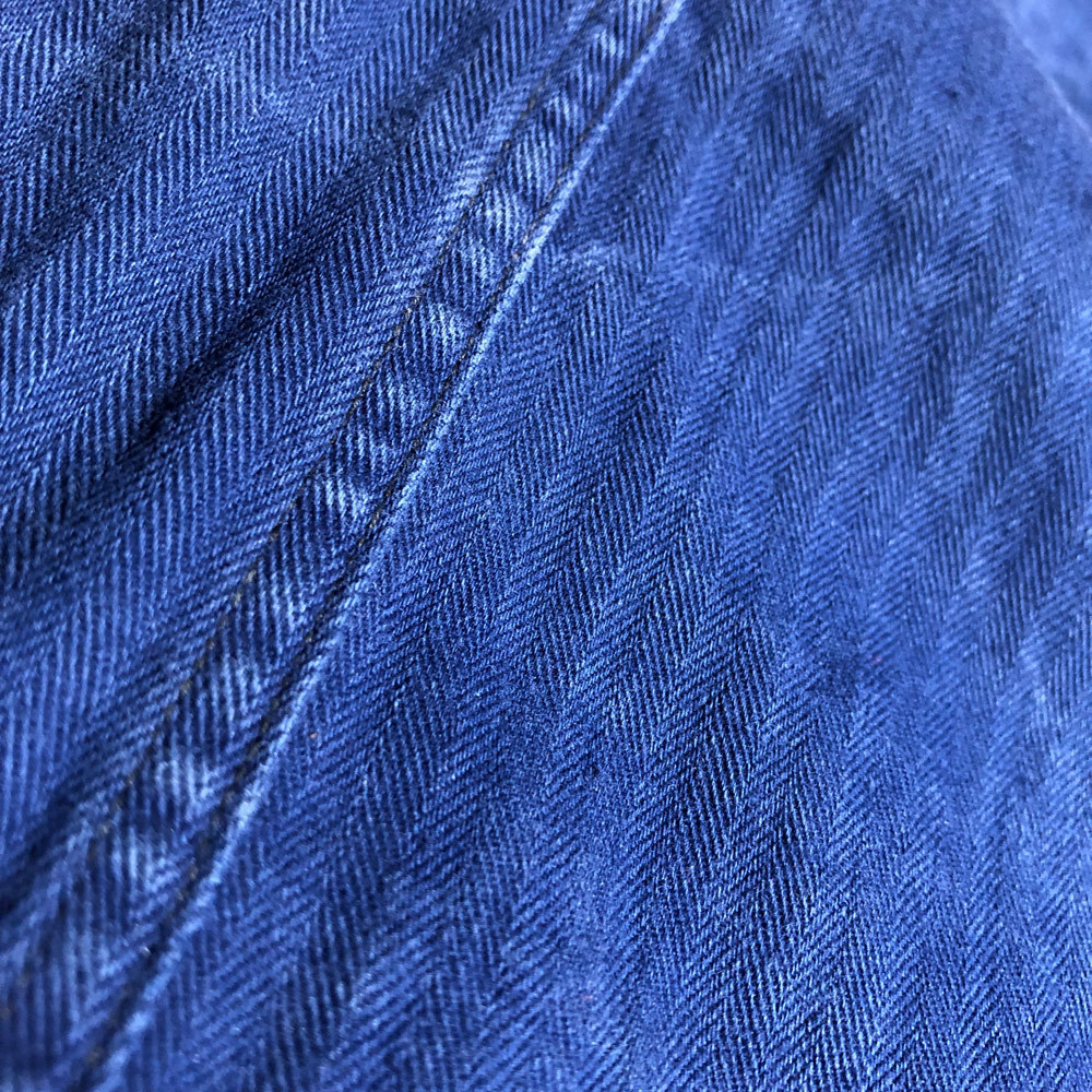 こちらはフランスのインクブルーを彷彿とさせる、美しいブルーカラーのHBT(ヘリンボーン)コットン素材を採用。そこまで厚手の生地ではない為、夏以外の3シーズン活躍してくれる丁度良い一品。