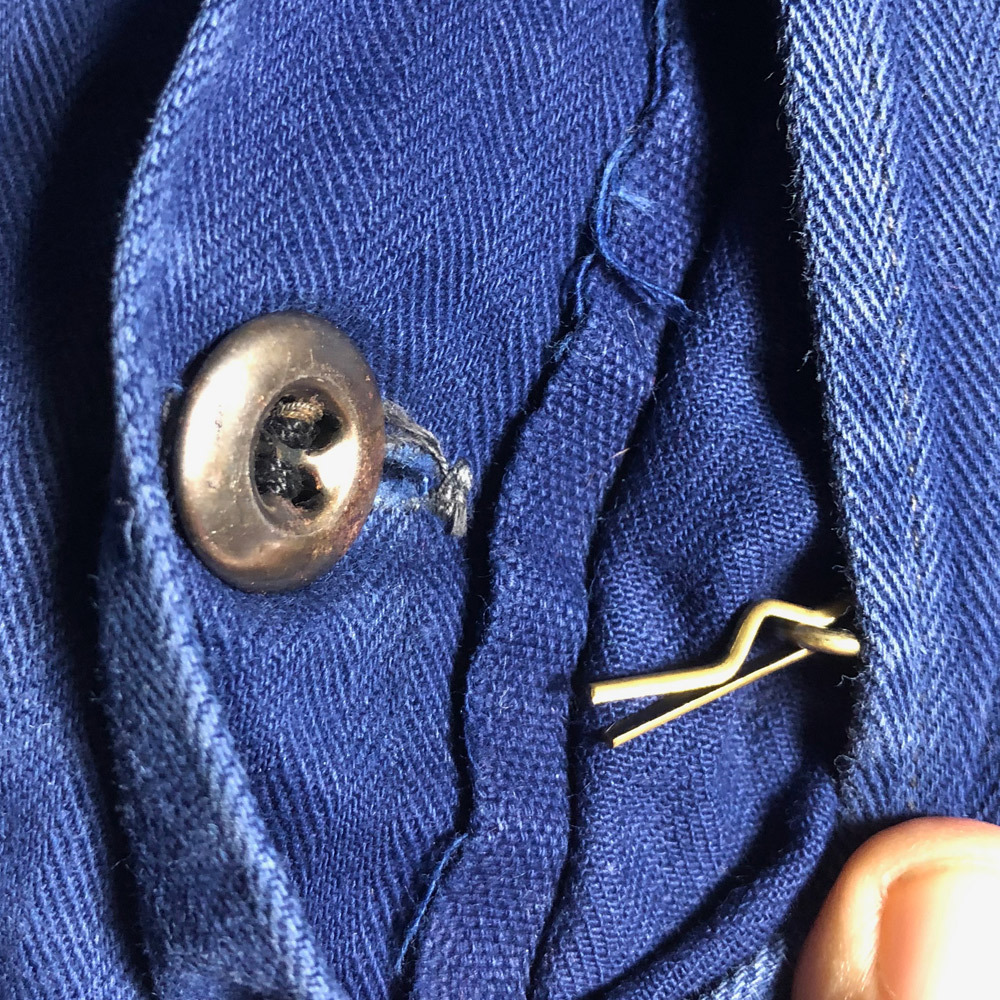 加えて、フロントは比翼仕立てになっており、表部分に出るゴールドボタンはチェンジボタンになっており、その下にシルバーメタルボタンを採用したフェイクボタン仕様。(恐らく洗濯する際にゴールドカラーが剥がれ落ちるのを防ぐ為、そして金具で傷つけるのを防ぐ目的。)