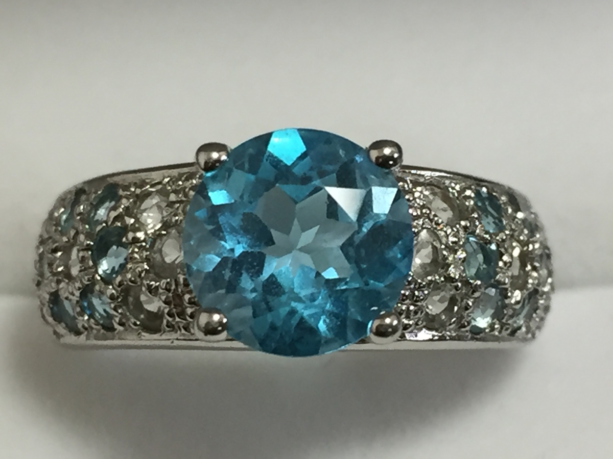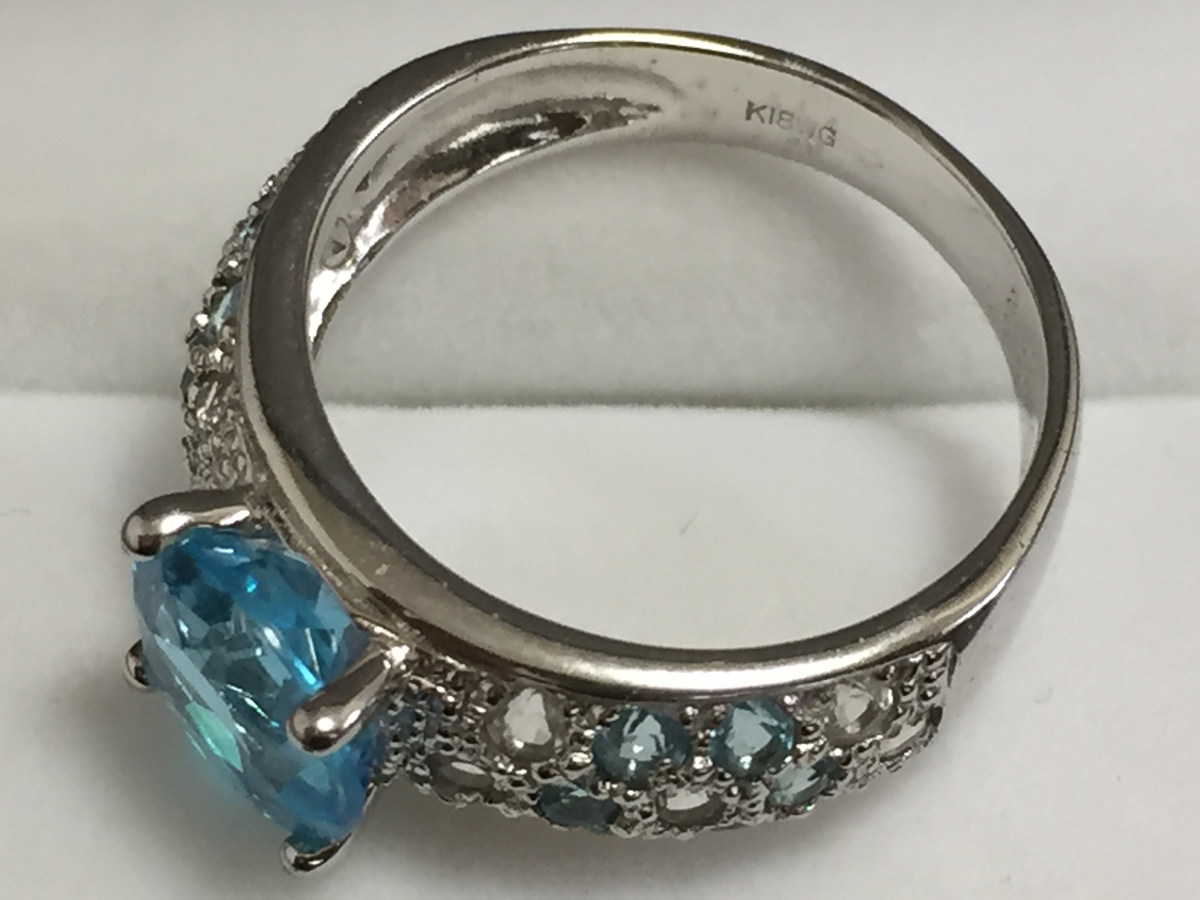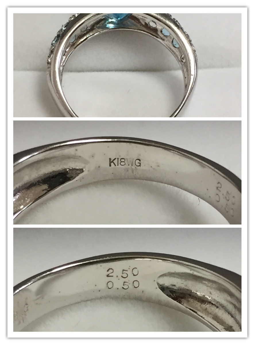 ブルートパーズ(2.50ct)、ダイヤモンド(0.50ct)、K18WGを使用した、デザインリングです。【2.50】【0.50】【K18WG】の刻印があります。 サイズ13号、重さ4.8g ブルートパーズ 2.50ct ダイヤモンド 0.50ct