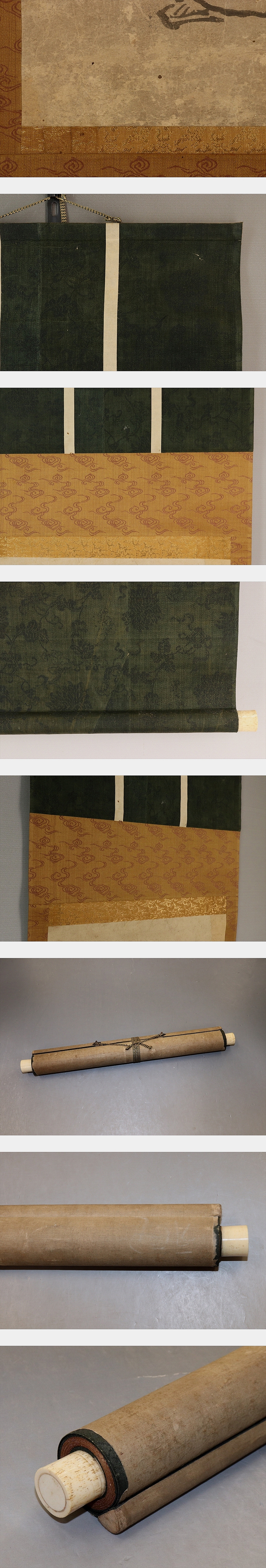 雪舟 せっしゅう(1420-1506) 室町後期の画僧。備中の人。諱は等楊。京都の相国寺に入り、画技を周文に学んだ。 山口に画房、雲谷庵を開設。渡明を挟んで宋元画を広く学び、のち大分に天開図画楼を開設。 自然に対する深い観照のもとに個性豊かな水墨山水画様式を完成し、後世に多大な影響を与えた。 本紙は、染み、汚れ、強い折れ、皺、擦れ、虫食、剥がれ、ヤケ、破れがあります。 表装は、染み、汚れ、折れ、皺、虫食、破れ、ほつれ、く剥れ、軸先に汚れと傷みがあります。 【サイズ】 作品 横約31cm×縦約62.5cm 表装 横約36cm×縦約136.5cm |