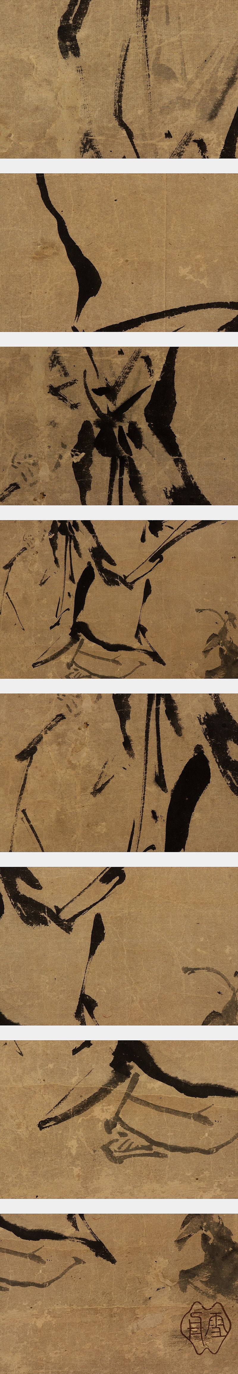 雪舟 せっしゅう(1420-1506) 室町後期の画僧。備中の人。諱は等楊。京都の相国寺に入り、画技を周文に学んだ。 山口に画房、雲谷庵を開設。渡明を挟んで宋元画を広く学び、のち大分に天開図画楼を開設。 自然に対する深い観照のもとに個性豊かな水墨山水画様式を完成し、後世に多大な影響を与えた。 本紙は、染み、汚れ、強い折れ、皺、擦れ、虫食、剥がれ、ヤケ、破れがあります。 表装は、染み、汚れ、折れ、皺、虫食、破れ、ほつれ、く剥れ、軸先に汚れと傷みがあります。 【サイズ】 作品 横約31cm×縦約62.5cm 表装 横約36cm×縦約136.5cm |