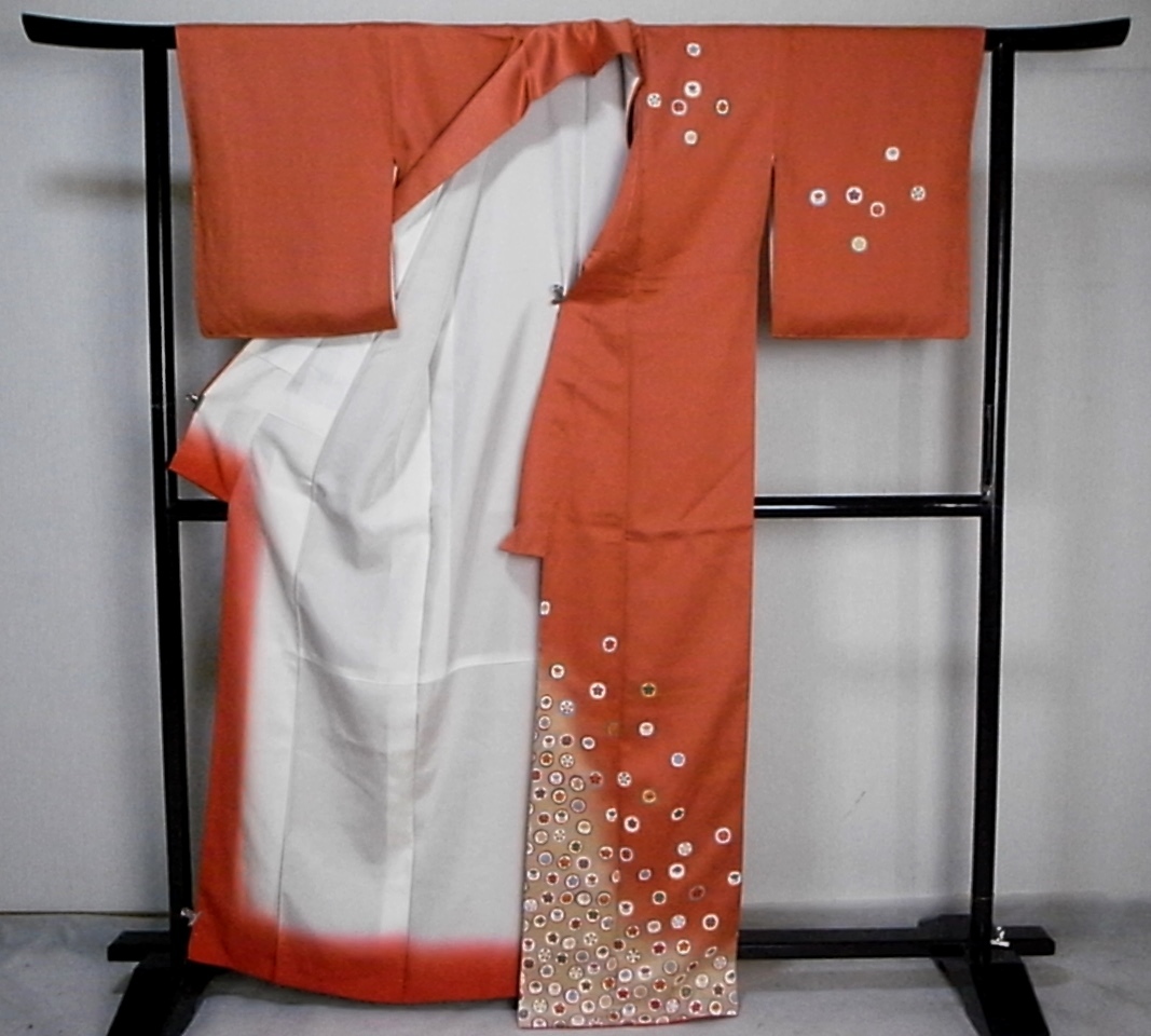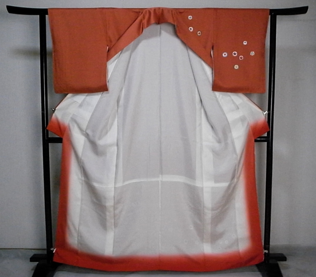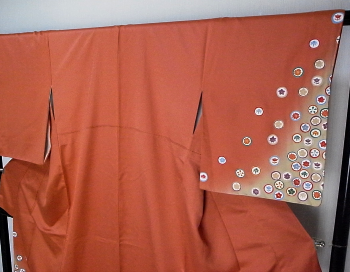正絹綸子ちりめん 薄茶柿色地・裾ぼかし丸紋華紋模様
