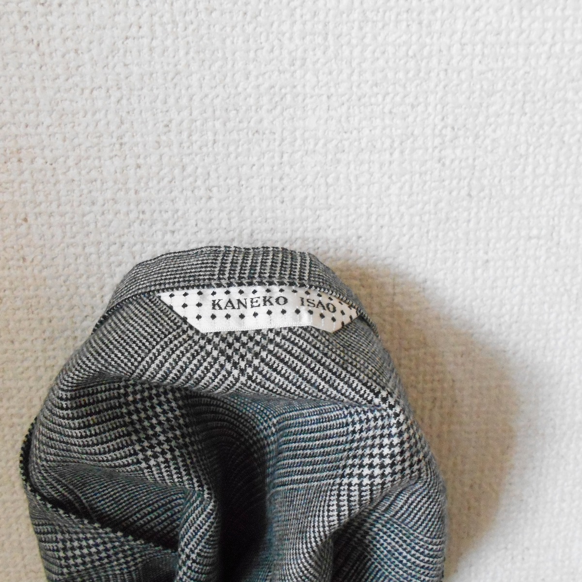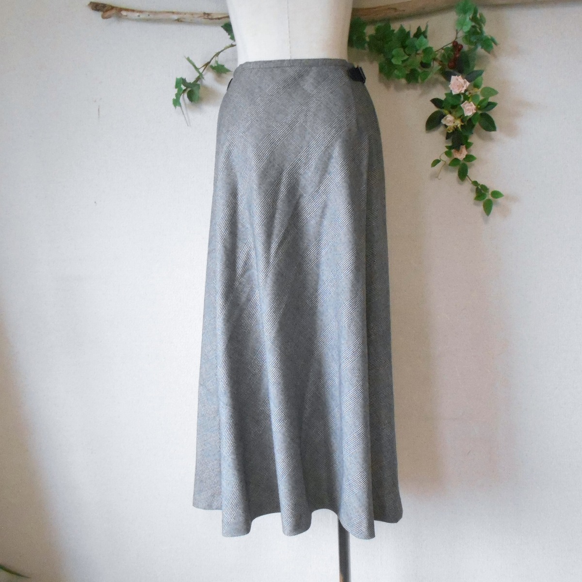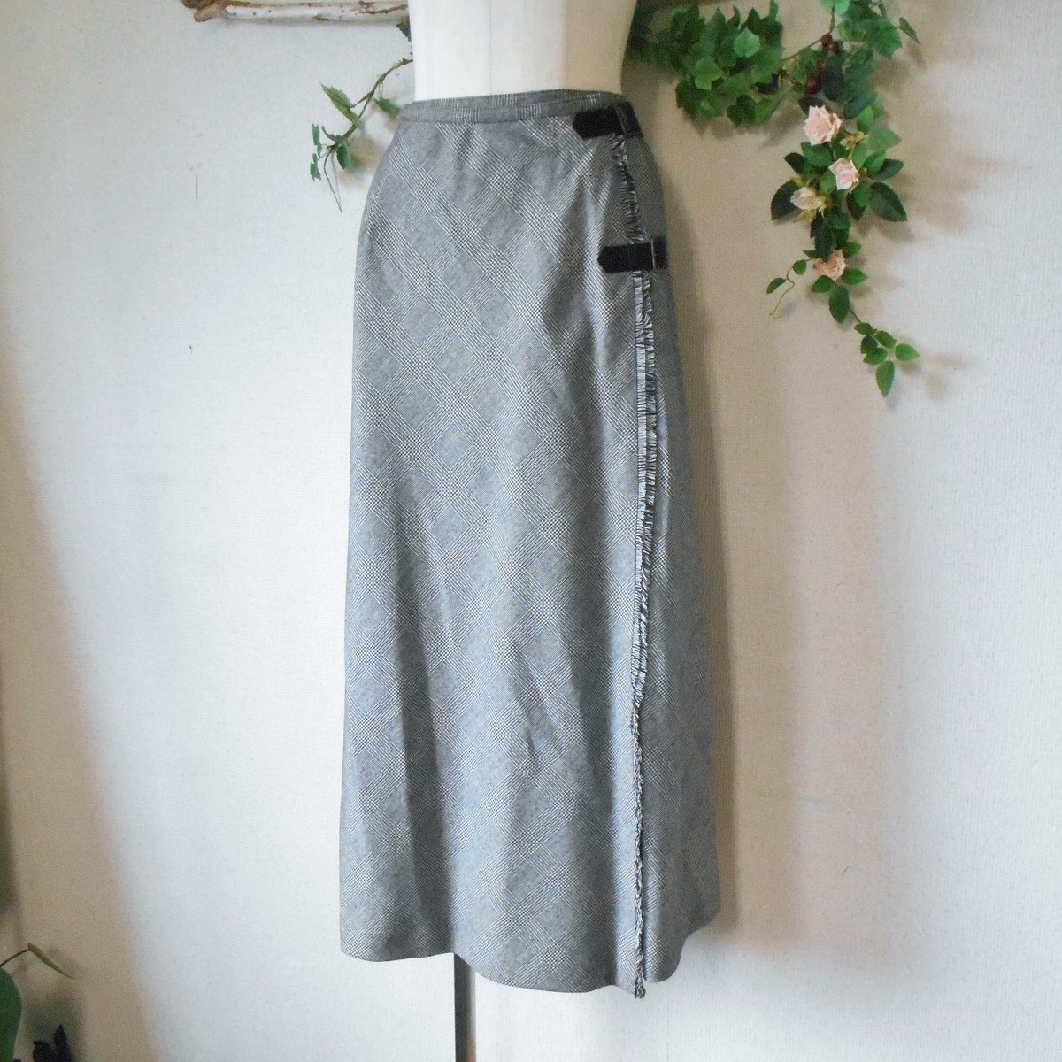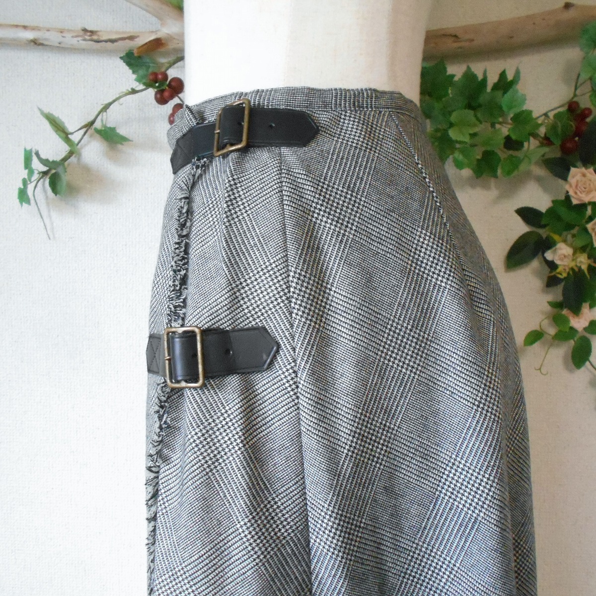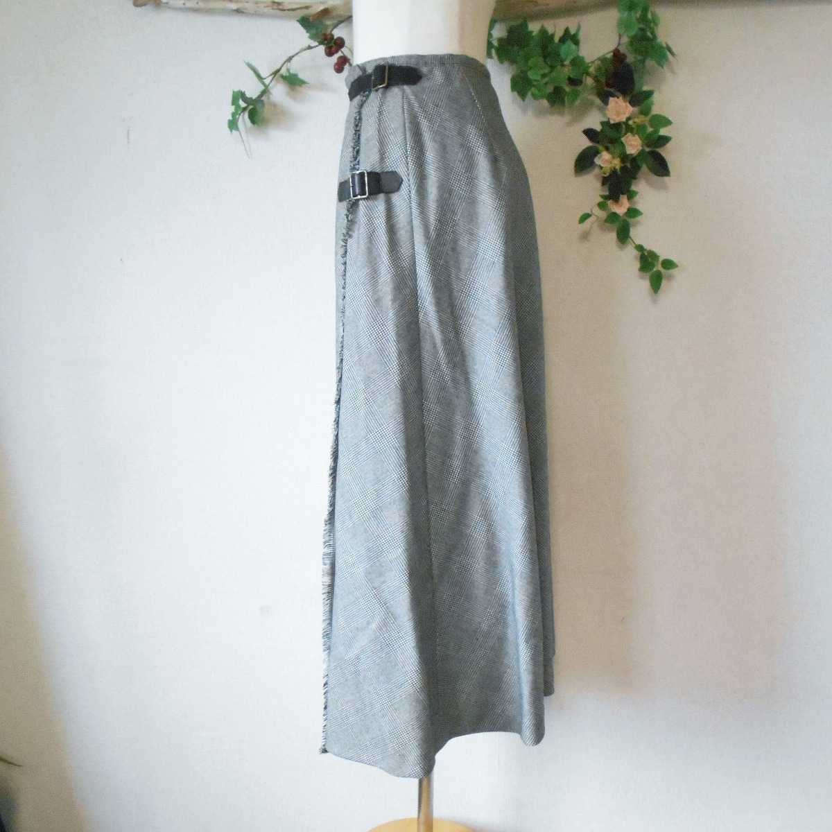 【ポイント】カネコイサオさんの巻きスカートになります。お色はグレー系のグレンチェックでウール100%の秋冬を中心に着ていただけるお品です。金子さんの定番的なデザインでとっても素敵な一着です。