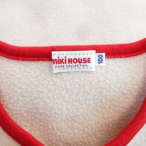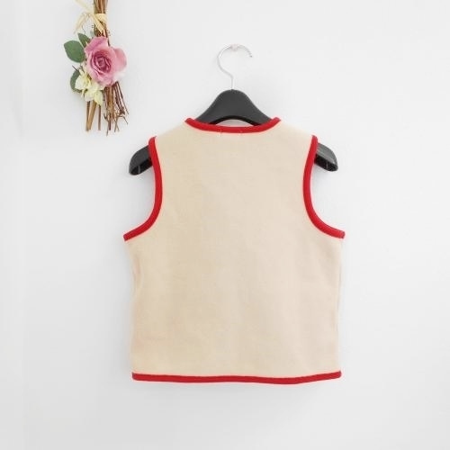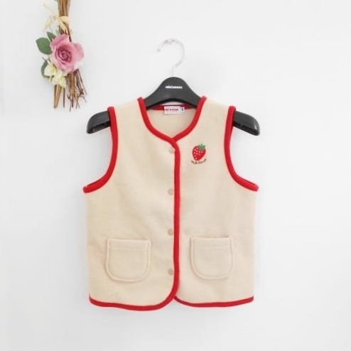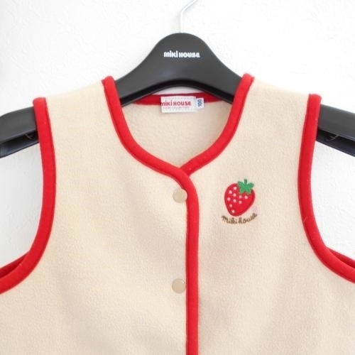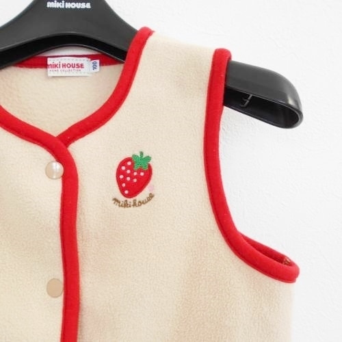 ミキハウス MIKIHOUSE キッズ 女の子の秋冬に暖かいフリースベストです。お色はベージュで縁取りが赤・レッドです。胸の苺ワッペンが可愛い一品です。軽くて着やすいベストです。