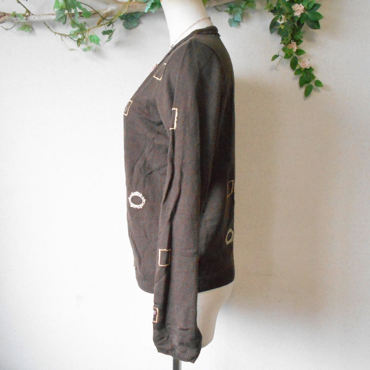 【ポイント】アクシーズファムの長袖カーディガンになります。お色はブラウンベースで、柄の部分は刺繍になっています。薄手ニットの秋冬春の3シーズン使えるお品で、襟ぐりや前のボタンサイドにはレースが使用された、とっても可愛い一着です。