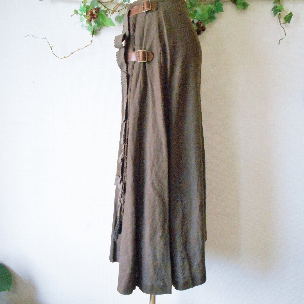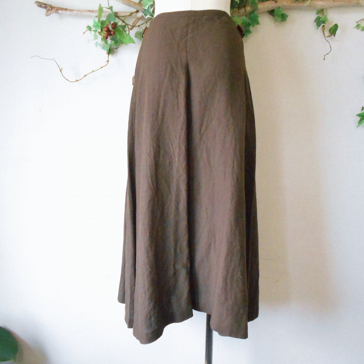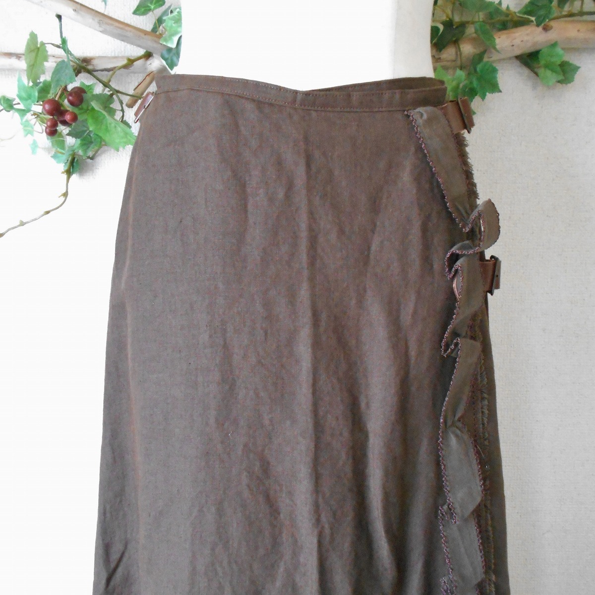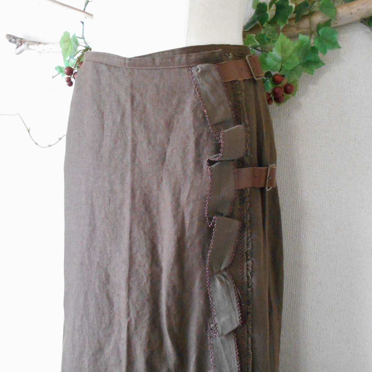【ポイント】カネコイサオさんの麻100%のスカートになります。お色はこげ茶色で、前で重なるタイプの巻きスカートです。両サイドにベルトが付いていてウエストの調整が可能です。