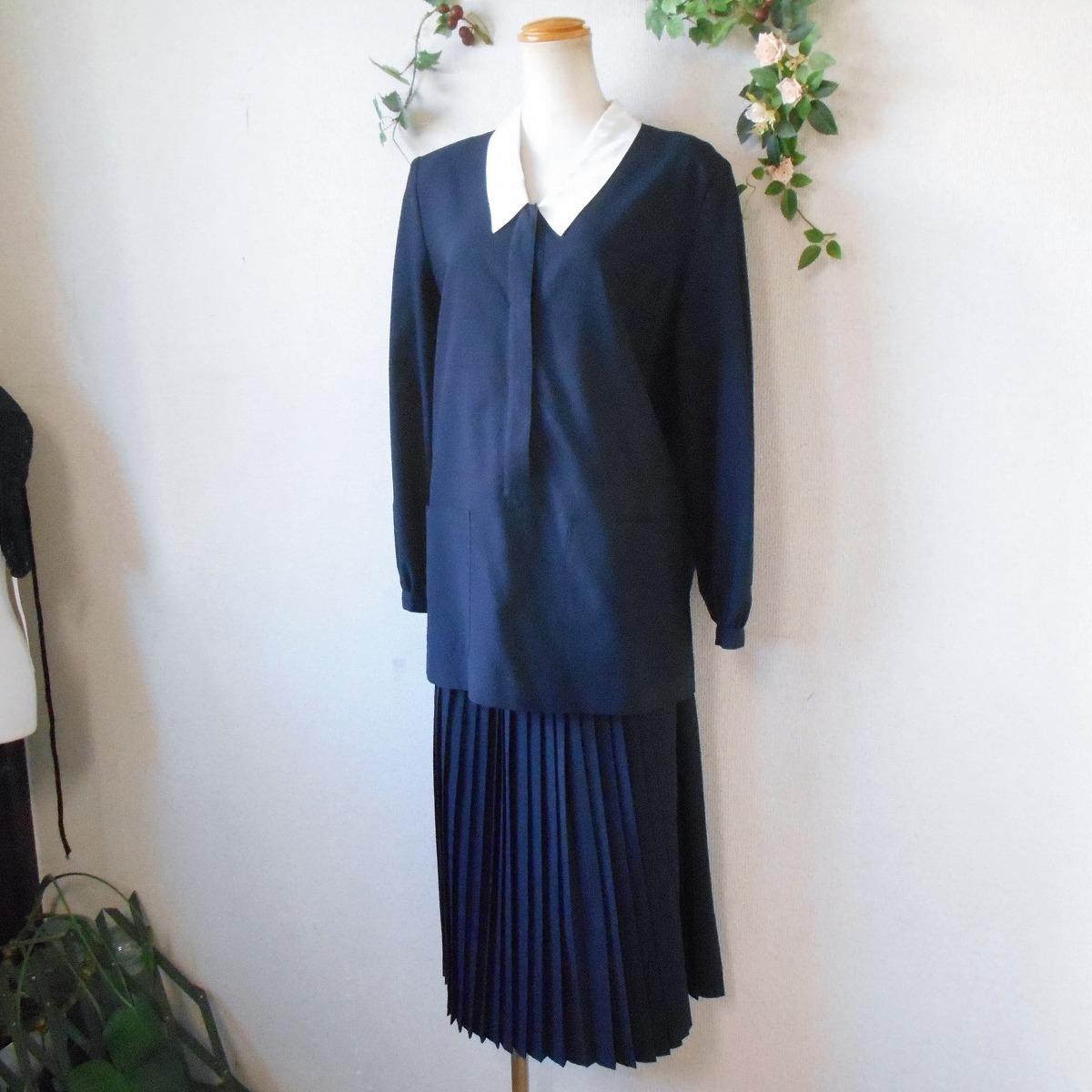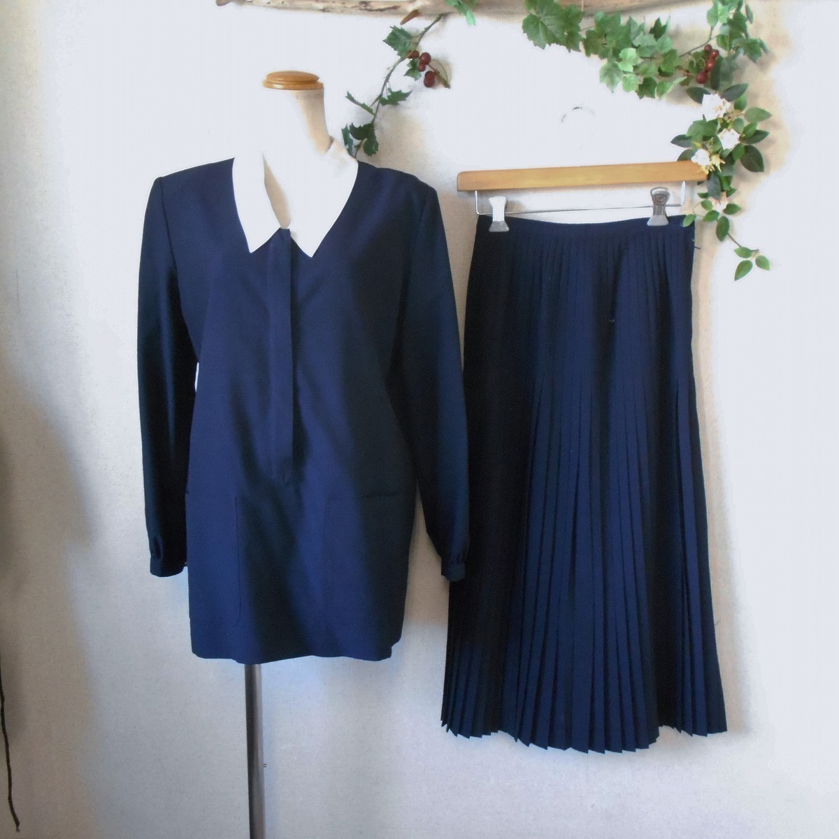 チュニック丈のトップスは白い衿付きで、スカートはロング丈の総プリーツになります。正確な年式は不明ですが、とても古いお品でレトロな雰囲気の素敵なセットです。