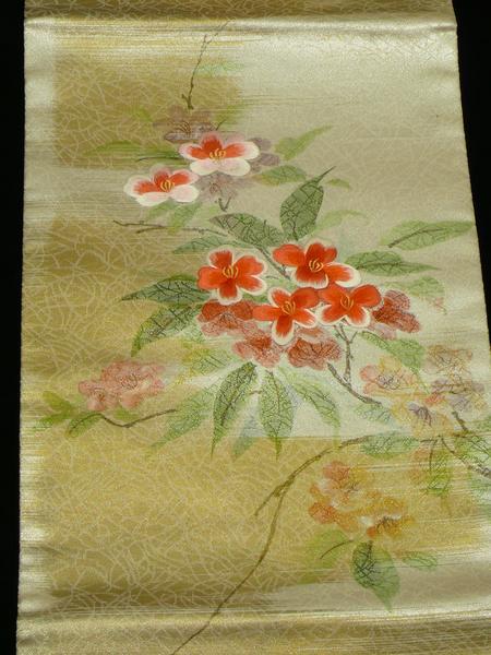 素材:正絹。幅31cm、長さ369.5cm。垂れ先より77.5cmに点の汚れ?が2か所あります。未使用かどうかわかりませんがアンティーク着物をご理解の方でしたら十分着用可能な範囲かと思います。