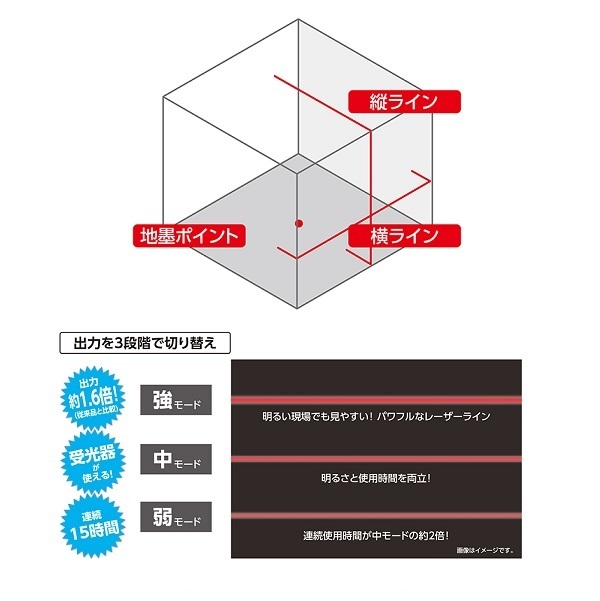 ●傾斜時警告:自動補正範囲を超えるとレーザーラインが点滅(約1秒間隔)