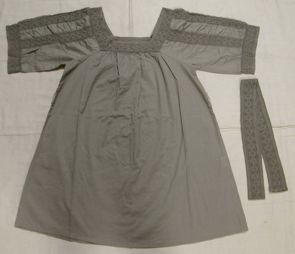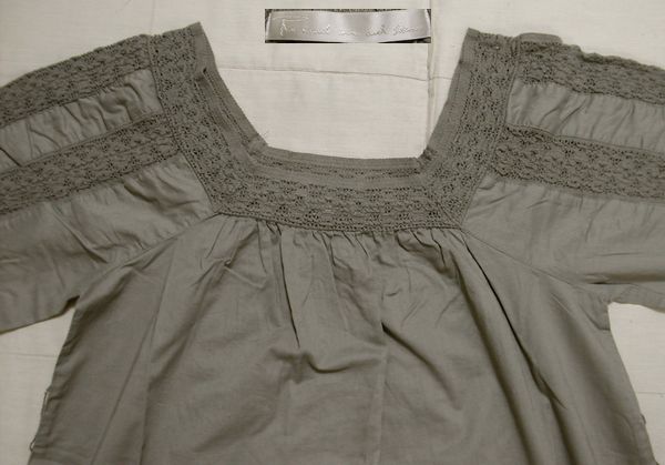 緑系の薄手素材で肩や首周りにレースが付いた涼しげなチュニックです。