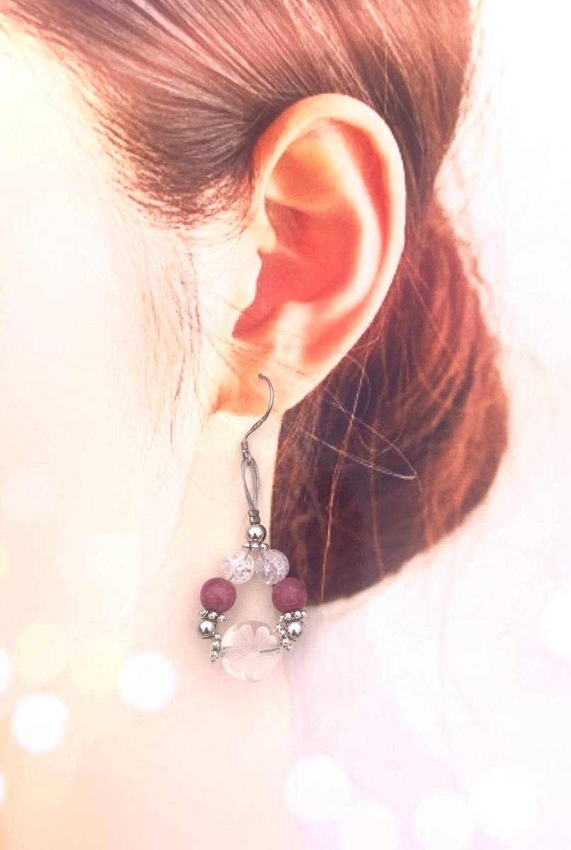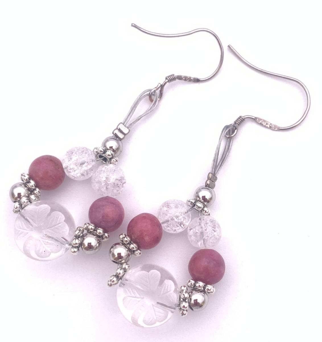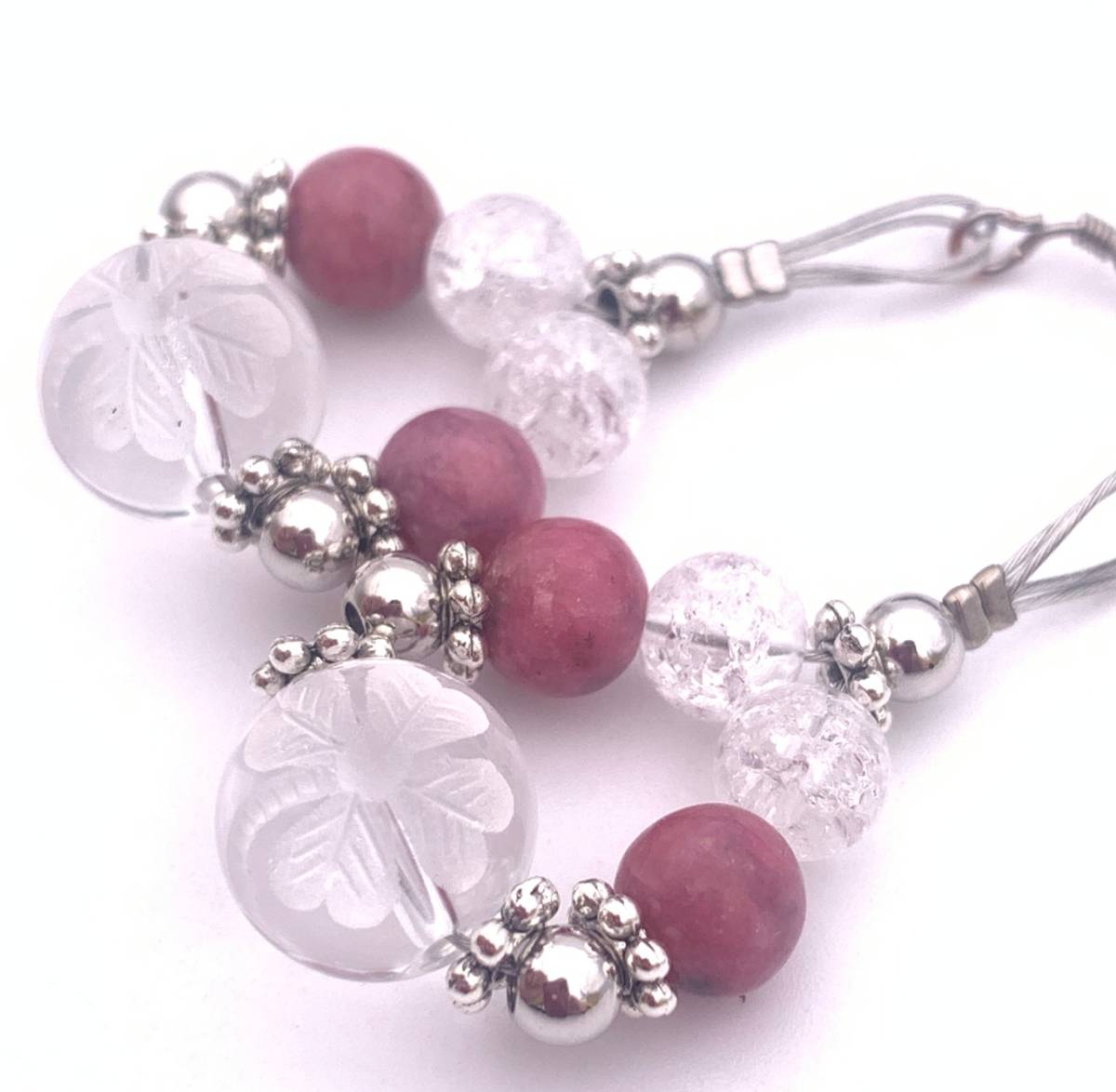 天然石彫り水晶四葉のクローバー&ロードナイト&クラック水晶のピアス
