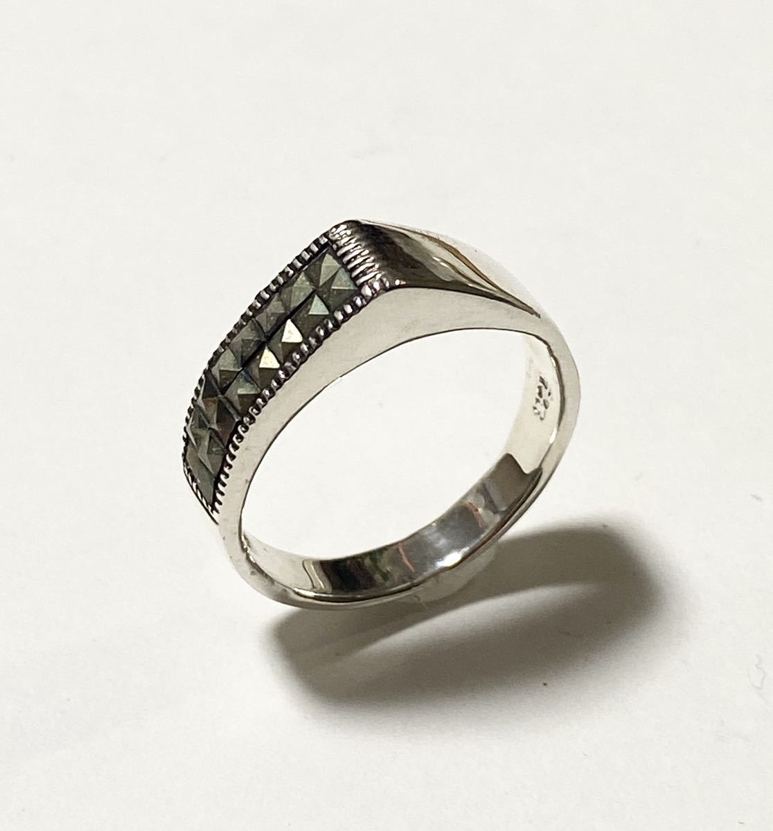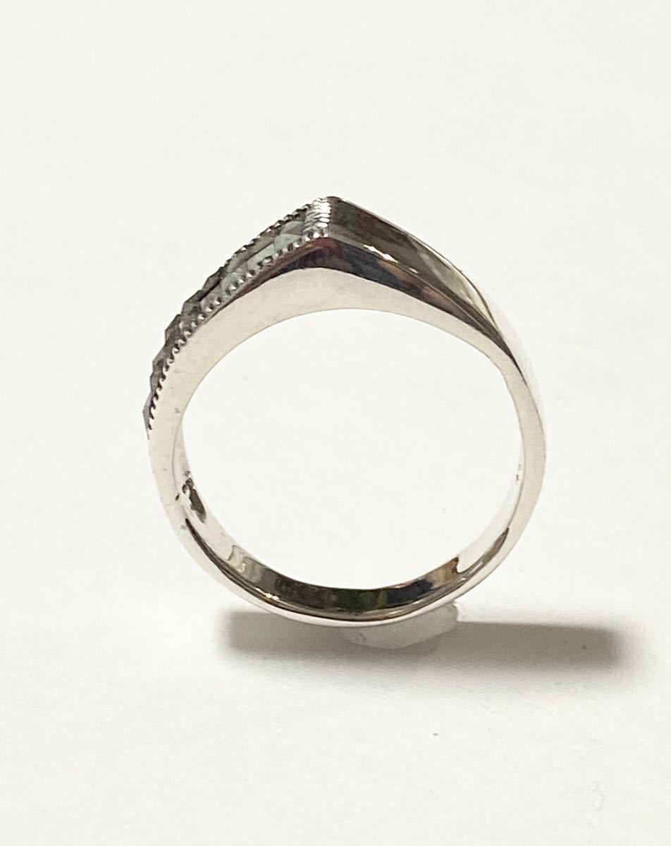 スクエアカットのマーカサイトが片側だけにセットされたアシンメトリーのお洒落なリングです。