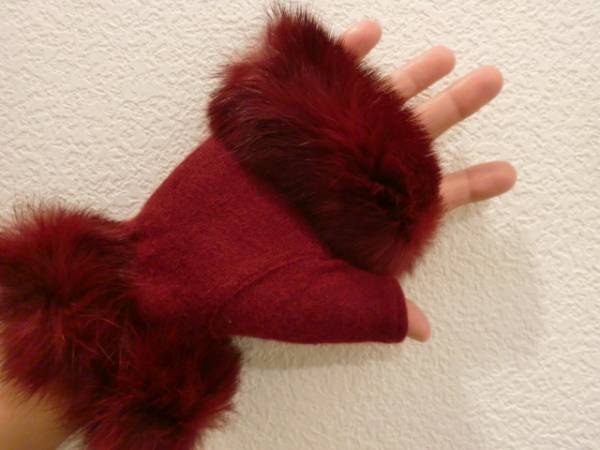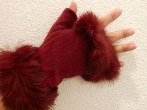 レディスファッション 手袋 天然ラビットファー上下付き指無し手袋 サービス品(エンジ)★!
