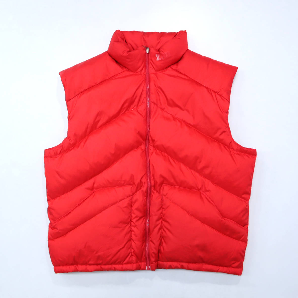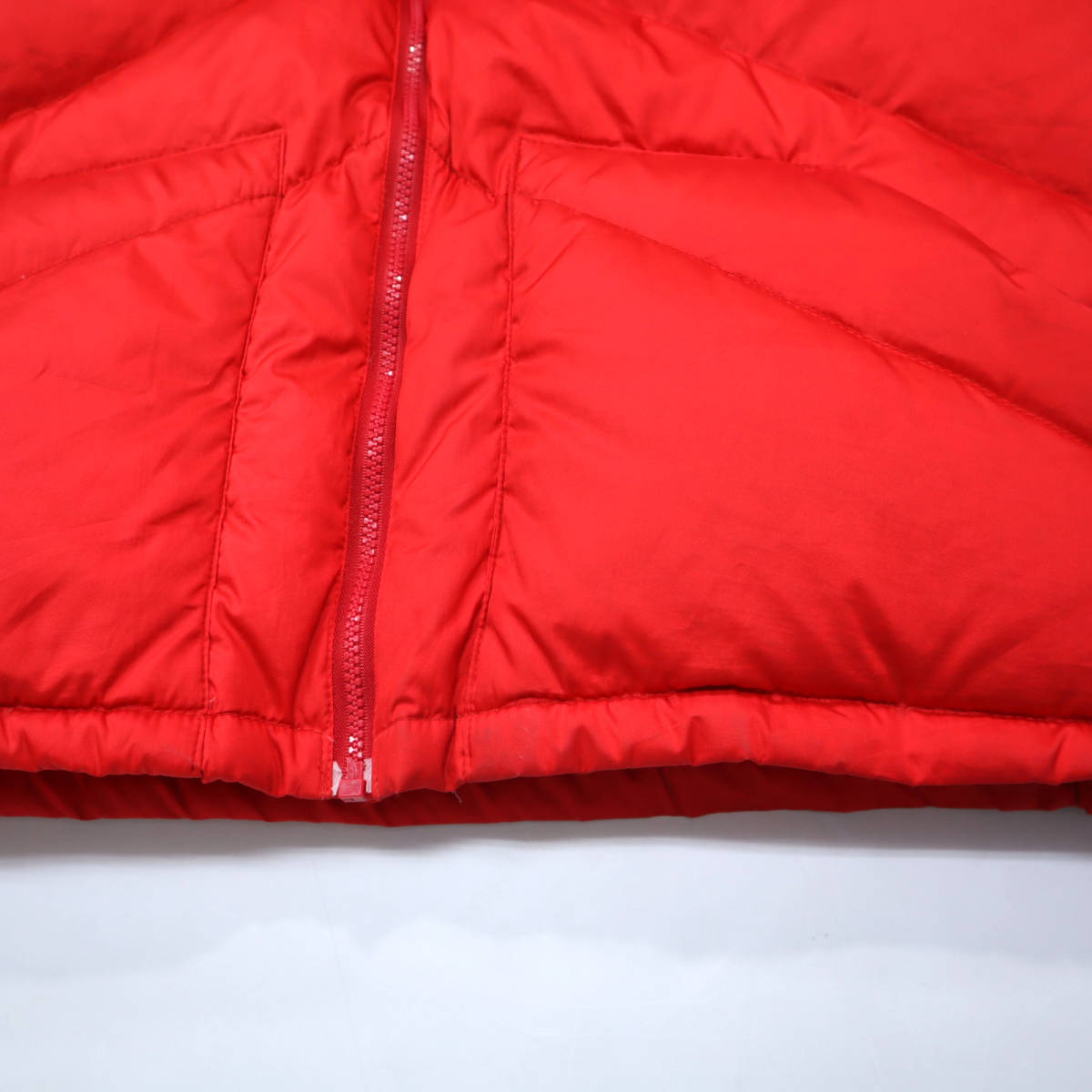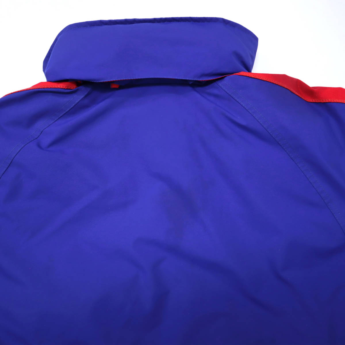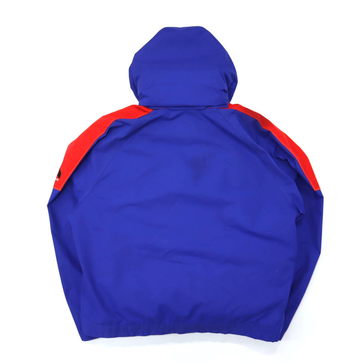 状態 シェルの右肩の赤いラインに10㎝程のシミ、赤ラインの淵に軽いほつれ、バック襟下に5㎝程のシミ、写真に掲載出来ておりませんが右ポケット下にも10㎝幅のシミと細かな汚れ、袖にも薄汚れがございます。ジャケットのライニング、襟下にも薄汚れ、ダウンベストの襟やポケット周りにも薄汚れがございます。ジャケット、ベスト共に洗濯済みで、ジャケットのシミは落ちませんでしたが、ライニングやベストの汚れは薄くなりました。ダウンは熱風で仕上げてますので、フカフカな状態です。素材はしっかりしてますので、まだまだご使用ただけます。