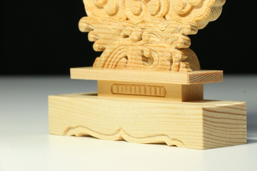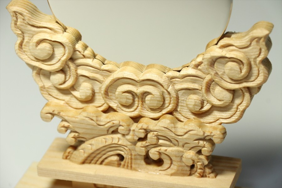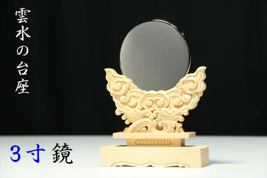 美しく彫り込まれた彫刻、手作業で作り上げられたとても豪華な「雲水彫神鏡」。 「雲」と「荒波」を表現する立体的な台座。大きな神棚セットやモダン神棚、祖霊舎など、祭壇周りを華やかに飾る神具として人気がございます。 | |||