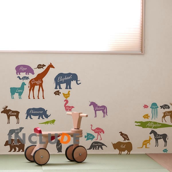 ウォールステッカー 動物英語 英語の勉強 狼 亀 キリン サイ ペンギン 魚 アリクイ コンドル 鹿 くらげ ムース カンガルー