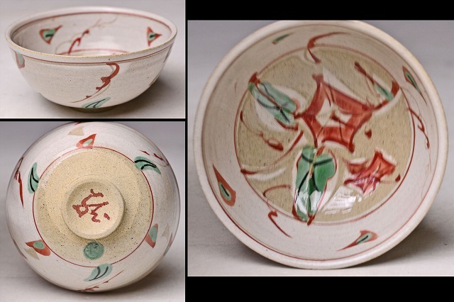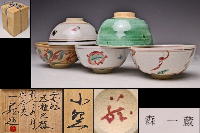 森一蔵 ★ 古萬古 赤絵風 五種 小碗 ★ 共箱 栞 ★ 氏の多彩な絵付が楽しめる贅沢な逸品 ★ 三重県 桑名市 無形文化財 ★検 日根野作三