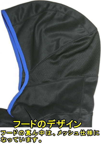 腹部のポケットは、従来品のパーカーと同じつくりですが、大きく異なるのは生地が薄く、裏地の起毛がないこと、フードの一部にメッシュ生地が採用されており、縁取りされているデザインになっていることです。