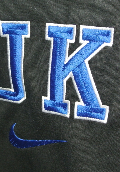 ブラックのポリエステル生地に、大学名とメーカーロゴが刺繍されています。