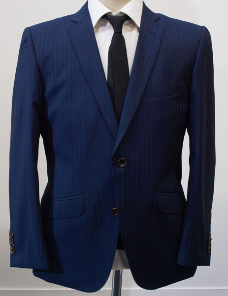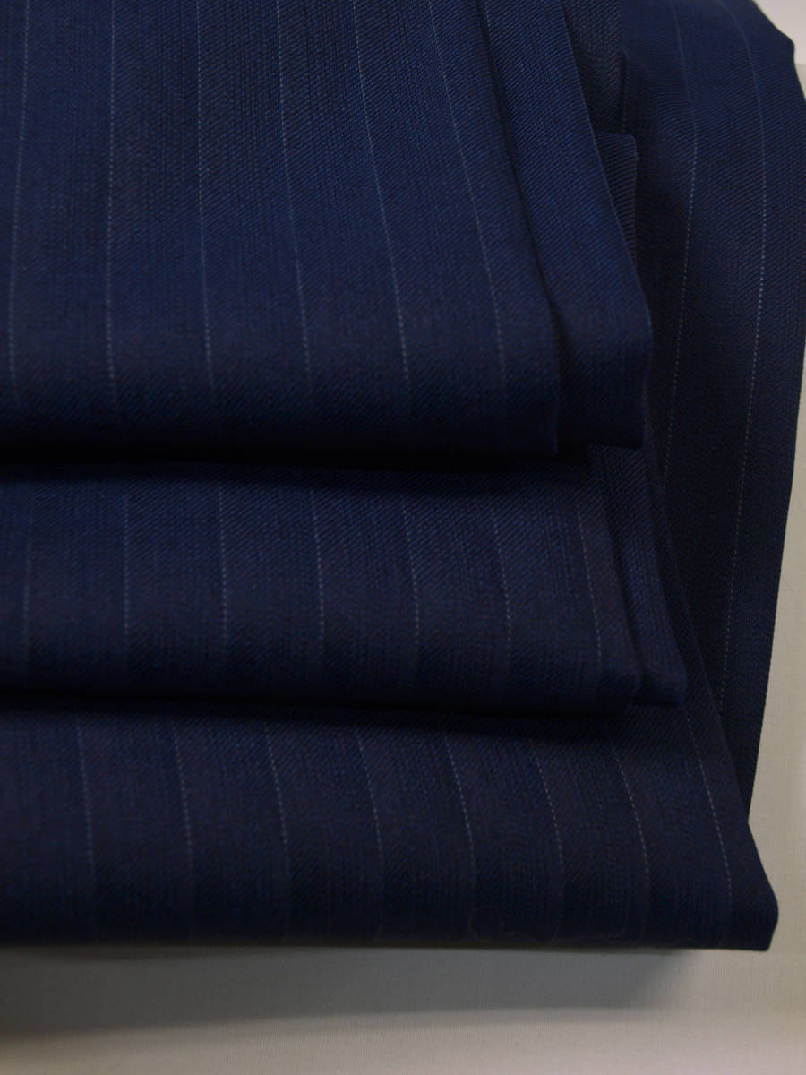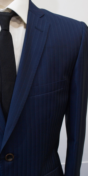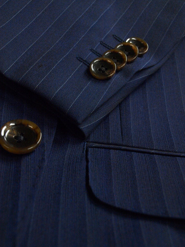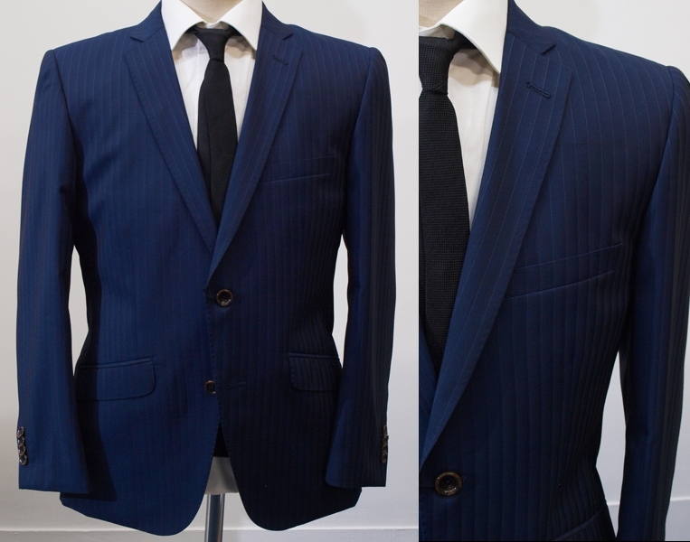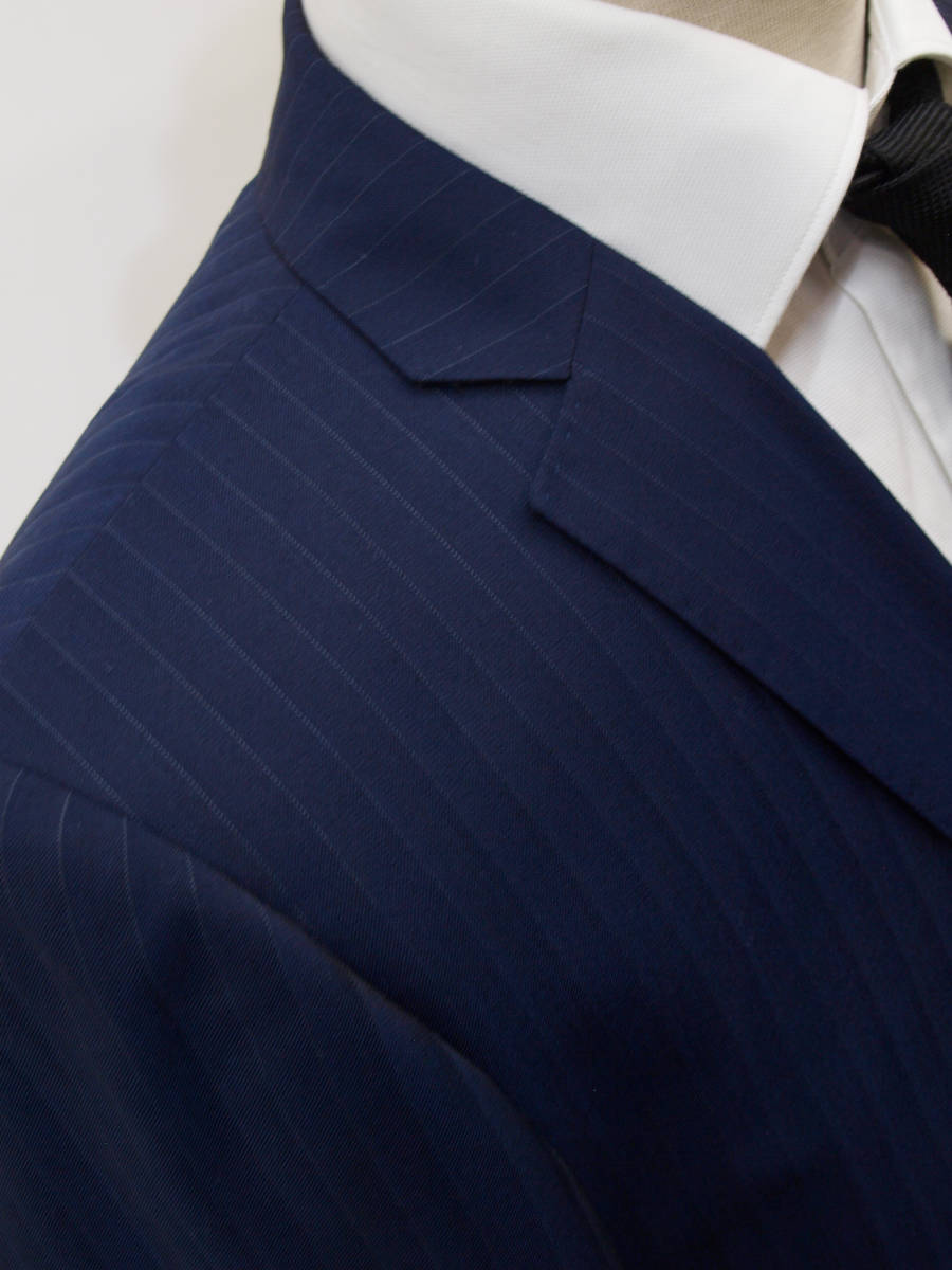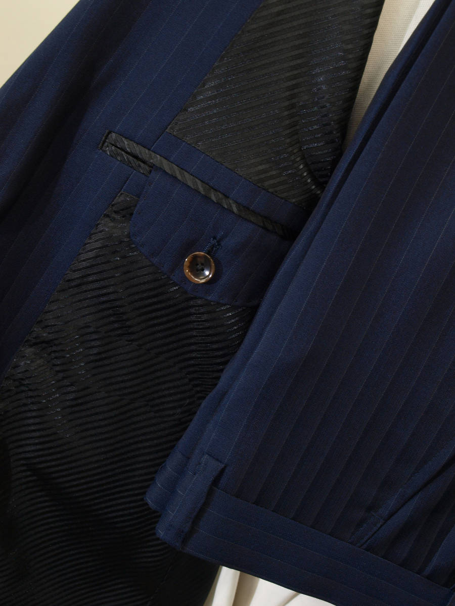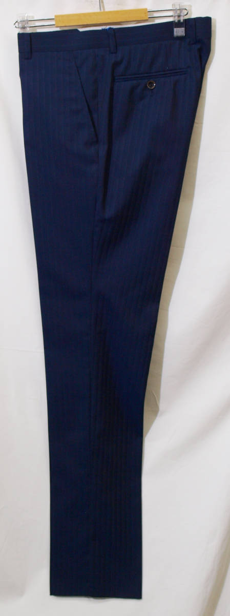 【サイズ】 AB4 (ABS号相当) 目安の体型 身長160cm~170cm、ウエストサイズ84cm前後 【ジャケット実寸】 肩幅45.5cm 着丈69cm 袖丈61cm 脇下部分51cm 身幅47cm 【パンツ実寸】 ウエスト(胴回り実寸)84cm (平置きでかるくはかると84cmでひっぱってはかると86cmです。股上が浅めなので実寸が2~3cm大きめに作られております。) わたり幅30.5cm(股下10cmの部位で28cm) 裾幅18.6cm 脇股上22.5cm 前股上24.5cm 股下88cm(裾上げしていない状態/新品) 【素材】 表地:ウール(毛)50% ポリエステル50% 裏地:胴裏/ポリエステル100% 袖裏/ポリエステル100% 真夏向けの生地と比べると厚みはありますが冬用の中ではそれほど厚手ではない秋冬向け紳士スーツ用ウールブレンド素材を使用。 【色】 青みの強い紺色 【柄】 シャドウストライプがはいっており1cm間隔で薄ブルーグレーのラインがはいったストライプ柄 【デザイン】 すっきりとしたコンパクトな印象の細身シルエット、タイトフィットスリム、ビジネススーツ新品、裾上げしていない状態です。 ・ジャケットはシングル2つボタンでスリムモデル ・パンツは股上が浅めで細いシルエットのノータックスリムパンツ 冬向けの中ではやや薄手の生地を使用した総裏地仕様のスーツで、ご着用の地域にもよりますが真夏を除くほぼオールシーズンご着用可能です。 【縫製仕様】 ・ジャケットはシングル2つボタン、ノッチドラペル、襟元等AMFステッチ入り、袖口ボタン4つ、センターベント、内ポケット4つ(小ポケット2つ含む)、総裏地(秋冬春対応) ・パンツはノータック、膝裏当て付き、脇ポケット斜め付け、後ろポケット左のみボタン付き、フロントはファスナーでボタン&ホック仕様/うちかけボタンあり 細部にわたりきちんとしたきれいな縫製仕立てで仕上がっております。