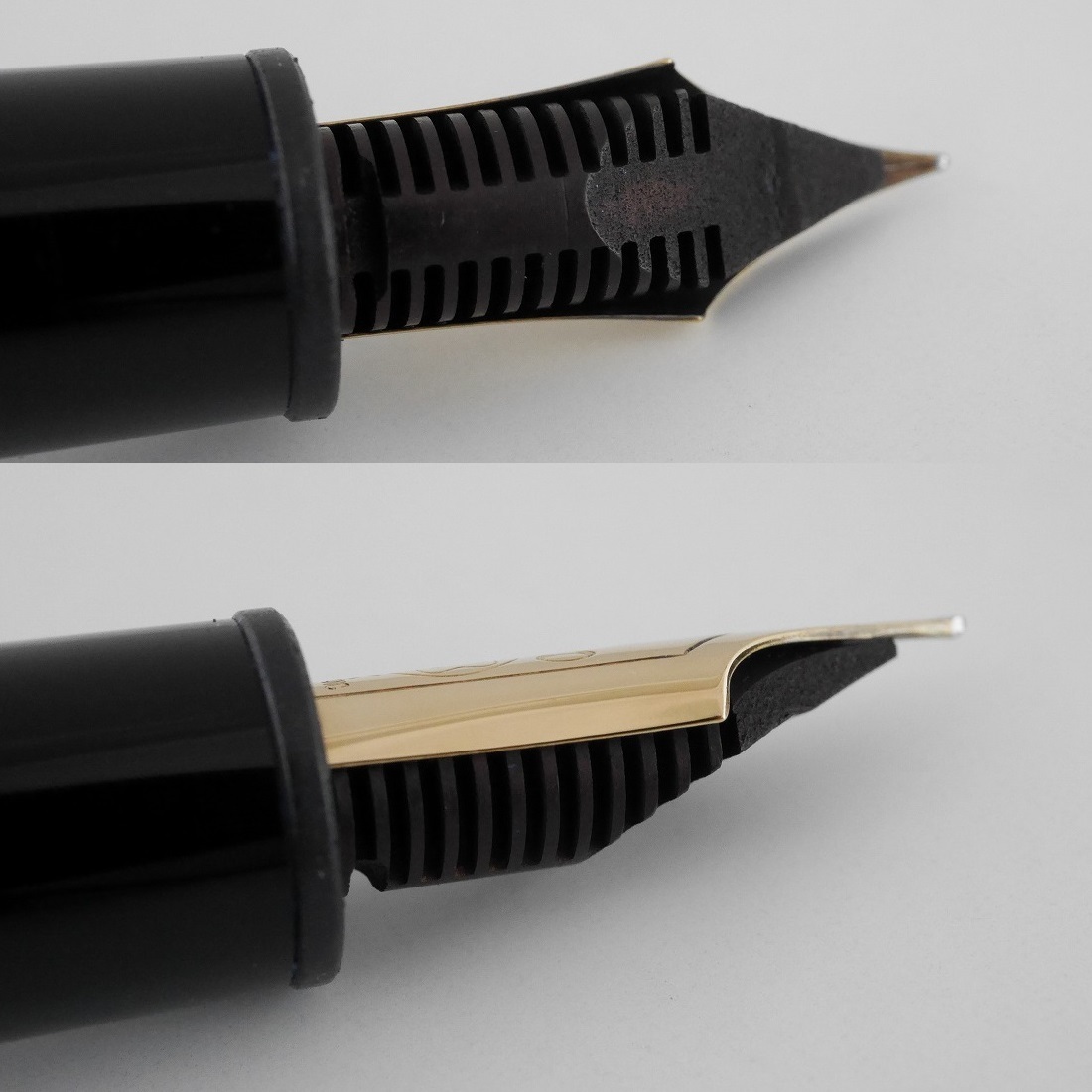 ピストン吸入式・14金無垢ペン先太さF(細字)です。14K刻印がございます。ペン芯はエボナイト2段型です。